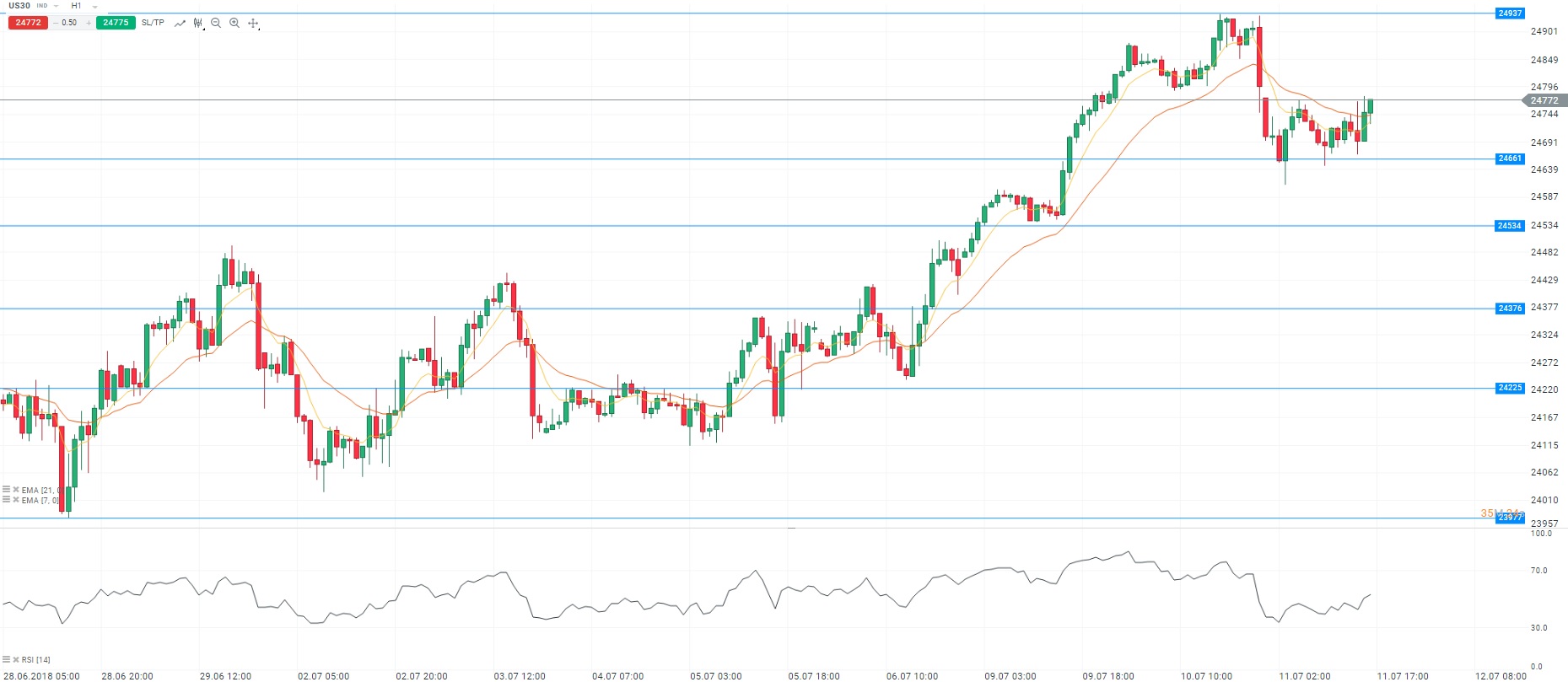 Pour l’heure les indices américains évoluent en territoire négatif dans le sillage de l’Asie et de l’Europe. La prudence est de mise après la nouvelle offensive des Etats-Unis sur le plan commercial. En effet, l’administration américaine a officialisé la mise en place de droits de douane de 10% sur 200 milliards de dollars de produits chinois. La Chine a déclaré vouloir faire appel auprès de l’Organisation mondiale du commerce (OMC). Ce regain des tensions commerciales pénalise les secteurs des matières premières et des semi-conducteurs. Par ailleurs, du côté des valeurs, Caterpillar et Boeing affichent des pertes supérieures à 1%. Ces entreprises étant exposées au conflit commercial. Sur le marché obligataire, le rendement du dix ans américain se replie sur le niveau des 2,85%. Enfin, nous faisons état d’une progression des prix à la production en juin aux Etats-Unis. D’un point de vue technique, les cours évoluent au-dessus de la moyenne mobile courte (à 7 périodes) en unité de temps horaire (H1). Le RSI est orienté à la hausse autour de sa zone de neutralité. En conclusion, nous avons un biais acheteur avec comme objectif le niveau des 24 856 points.
