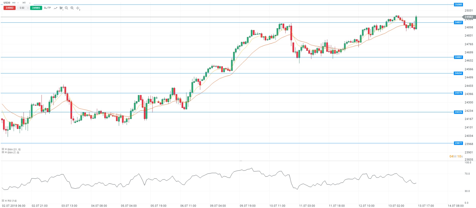 Les indices américains évoluent en territoire positif après la publication des premiers résultats du deuxième trimestre aux Etats-Unis. En effet, JPMorgan a publié un bénéfice en hausse de 18,3% au deuxième trimestre. En revanche, Citigroup perd du terrain malgré l’annonce d’une progression de 16% du bénéfice tandis que Wells Fargo est pénalisé par une baisse de 12% de son bénéfice trimestriel. Sur le marché des changes, la paire EURUSD est repassée au-dessus du niveau de 1,1650 dollar pour un euro. Enfin, nous faisons état d’une dégradation du moral des consommateurs américains au mois de juillet selon l’indice Reuters-Université du Michigan. Concernant l’analyse technique, les cours fluctuent au-dessus de la moyenne mobile courte (à 7 périodes) en unité de temps horaire (H1). Le RSI est orienté à la hausse autour de sa zone de neutralité. Ces éléments nous conduisent à avoir une préférence à l’achat avec pour objectif le niveau des 25 080 points.