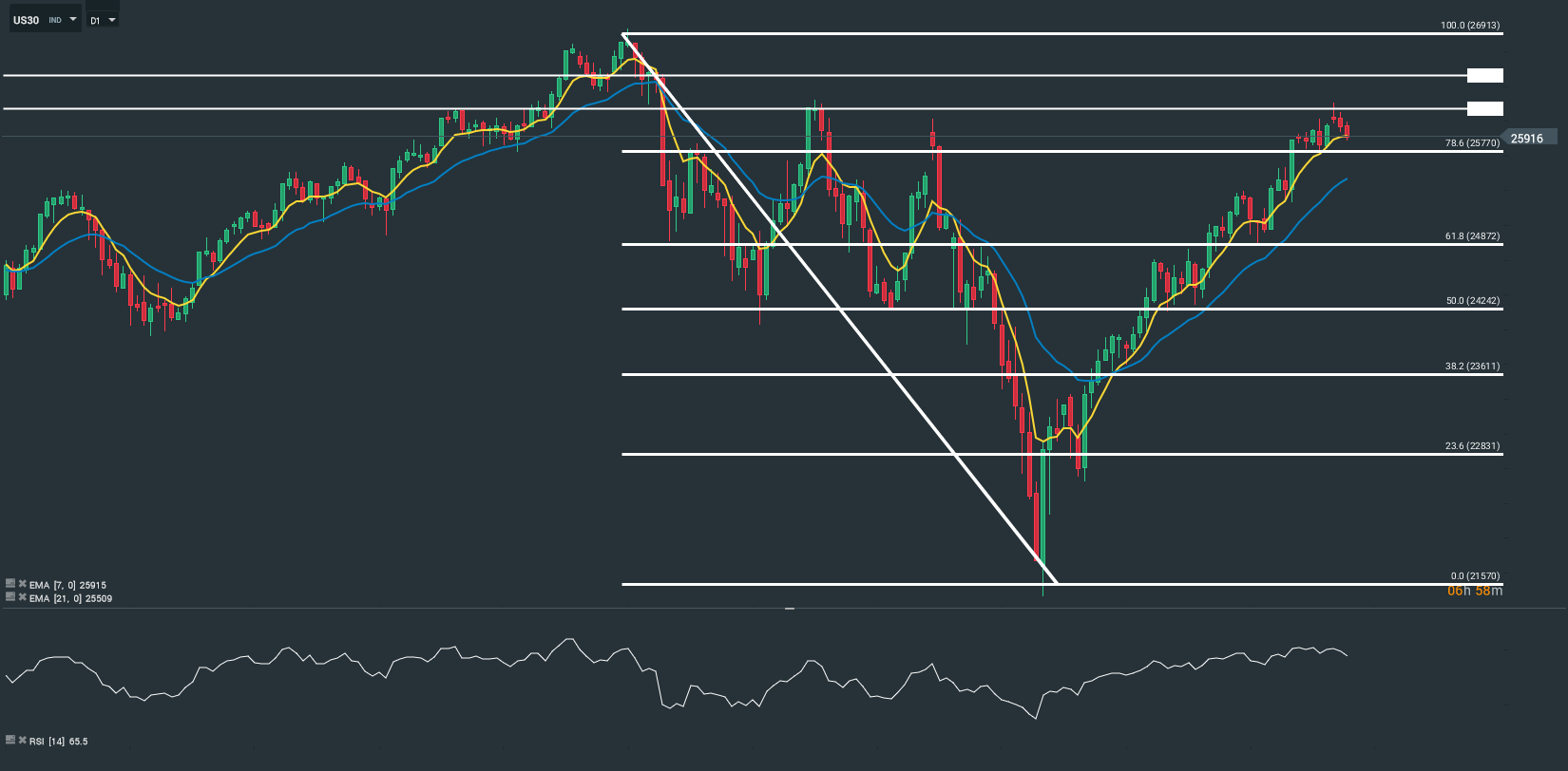 Sur le plan technique, en horizon temporel (D1), l’indice évolue en territoire négatif. Nous constatons que les cours sont capés par une résistance de long terme (au niveau des 26 196 points). Les cours ont franchi (à la baisse) la moyenne mobile à 7 périodes. Le RSI est orienté à la baisse et oscille au-dessus de sa zone de neutralité (65,5). Pour l’heure, nous avons un biais neutre sur le Dow Jones.
