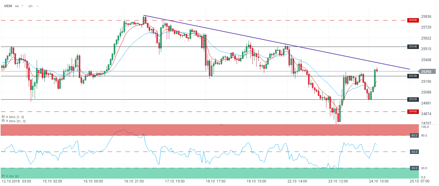 Représentation de l’indice Dow Jones (US30), en unité horaire (H1)