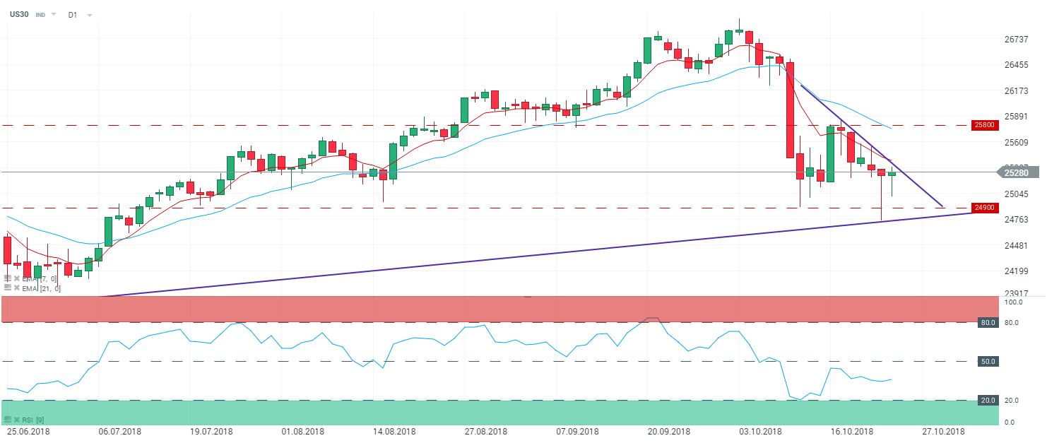 En unité journalière (D1), l’indice Dow Jones évolue en tendance baissière au sein de sa zone de range comprise entre 25 800 points et 24 900 points. Les cours évoluent en-dessous de la résistance oblique. Le tout formant un triangle descendant. Les prix sont capés par les moyennes mobiles à 7 et 21 périodes. Le RSI tend à s’aplatir et oscille à 35,2 points.