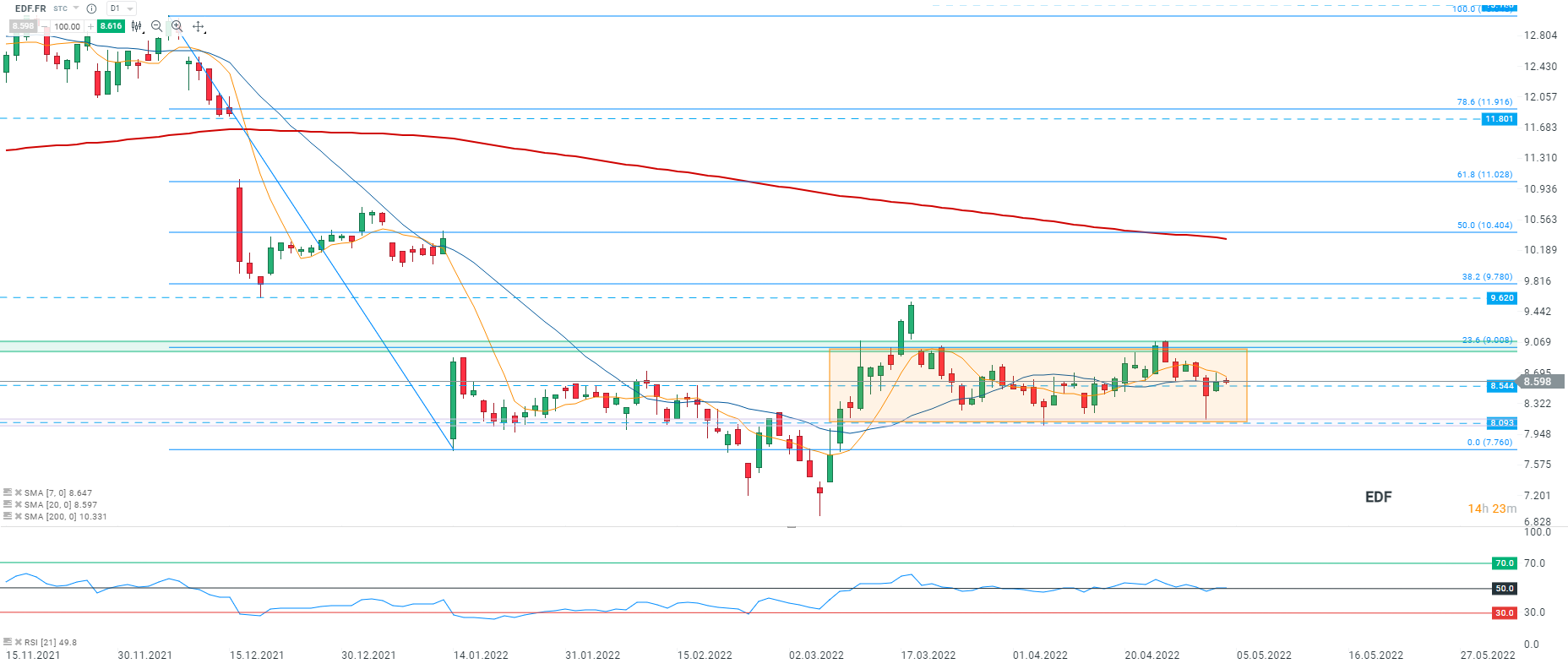Les cours d’EDF (EDF.FR) évoluent de manière mitigée depuis le gap du 14/01 et continuent d’évoluer au sein d’un range intégré début mars 2022. Au moment de la rédaction de ces lignes, les cours évoluent à la baisse, proches du support à 8,544. En cas de cassure de ce niveau, un mouvement baissier en direction du support à 8,093 pourrait être initié. Toutefois, le RSI évolue proche de sa zone de neutralité mais légèrement au-dessus, ce qui signifie que les acheteurs pourraient avoir pris l’avantage. Source : xStation5