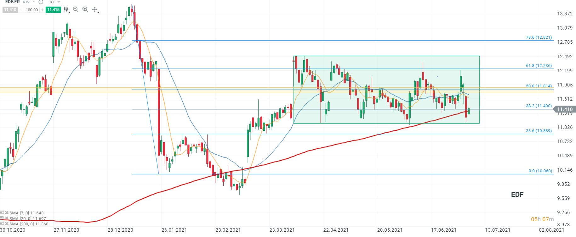 Le titre EDF (EDF.FR) évolue à la hausse aujourd’hui, porté par les nouvelles positives des perspectives du groupe. Les cours tentent actuellement un dépassement du niveau de retracement de Fibonacci à 38,2% de la baisse entamée en janvier 2021. En cas de succès, le mouvement haussier pourrait s’étendre au prochain niveau de retracement de Fibonacci (50%) à 11,814. Toutefois, si les vendeurs prennent le contrôle la borne inférieure du range à 11,108 constitue la prochaine cible. Source : xStation5