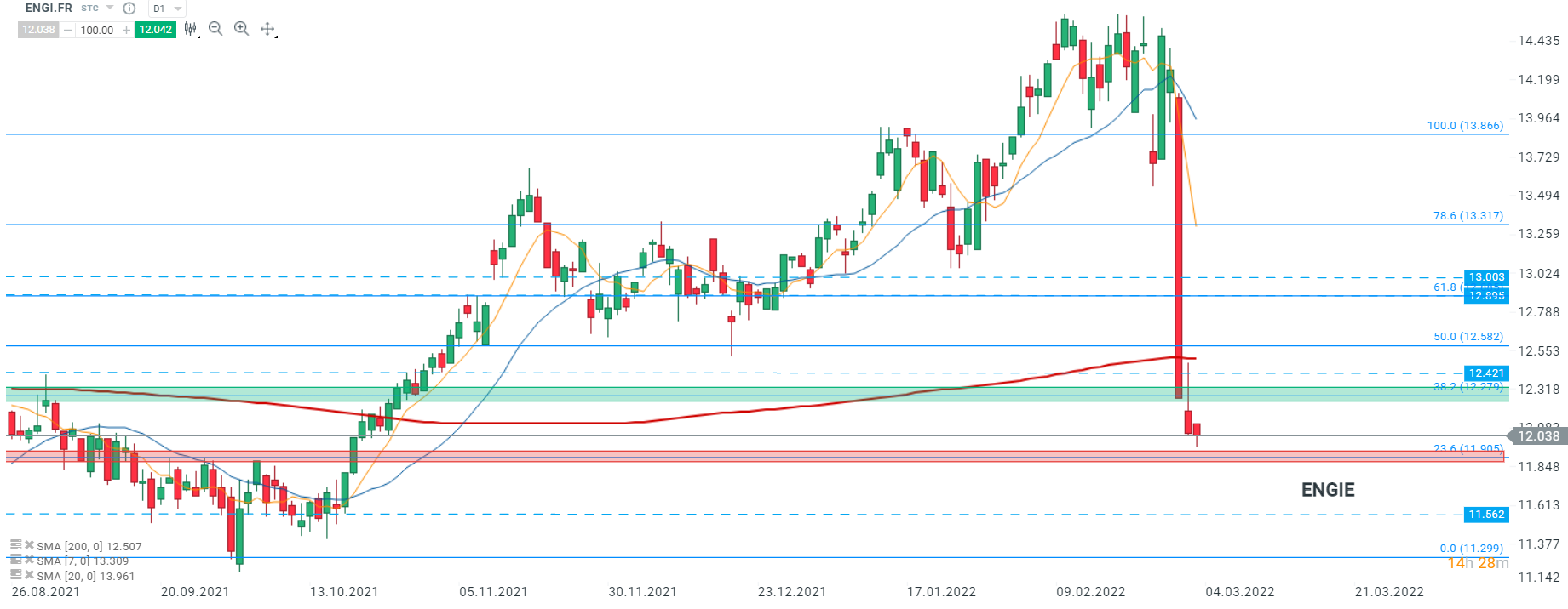 Les cours d’Engie (ENGI.FR) ont ouvert à la baisse se dirigeant vers la zone de support à 11,905 où coïncide le retracement de Fibonacci à 23,6% de la baisse entamée en janvier 2021. En cas de cassure de ce niveau, le mouvement baissier pourrait s’étendre en direction du prochain support à 11,562. Toutefois, si les acheteurs prennent le contrôle, la résistance à 12,279 serait à envisager. Source : xStation5