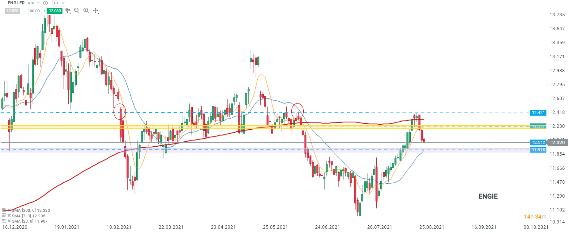 Après avoir échoué dans la tentative de franchissement de la zone de résistance majeure à 12,421, les cours d’Engie (ENGI.FR) évoluent à la baisse. Au moment de la rédaction de ces lignes, les cours se dirigent vers la zone coïncidant avec la SMA 20 (ligne bleue) et la zone de support à 11,918. Si les acheteurs prennent le contrôle, la zone de résistance à 12,237 constitue la prochaine cible. Source : xStation5