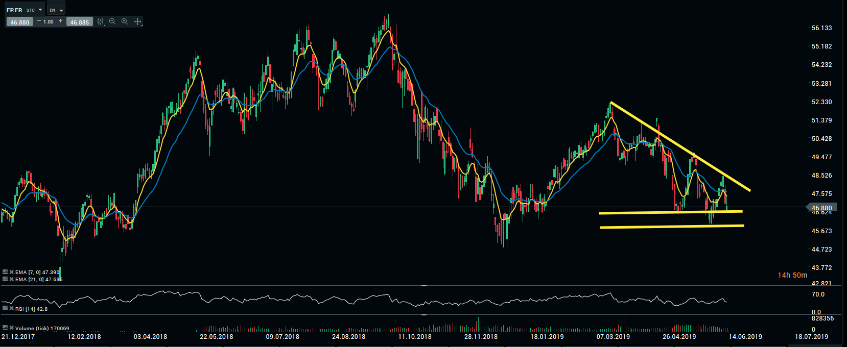 Hier, les prix du pétrole ont flambés suite à l’incident survenu au large des côtes omanaises. Portés par les valeurs pétrolières et para pétrolières, les indices ont terminé la séance en gains positifs. Total et TechnipFMC sont les valeurs que nous surveillerons aujourd’hui. Le titre Total (FP.FR) évolue dans un triangle descendant. L’évolution des cours de l’Or noir orientera l’action du géant pétrolier.