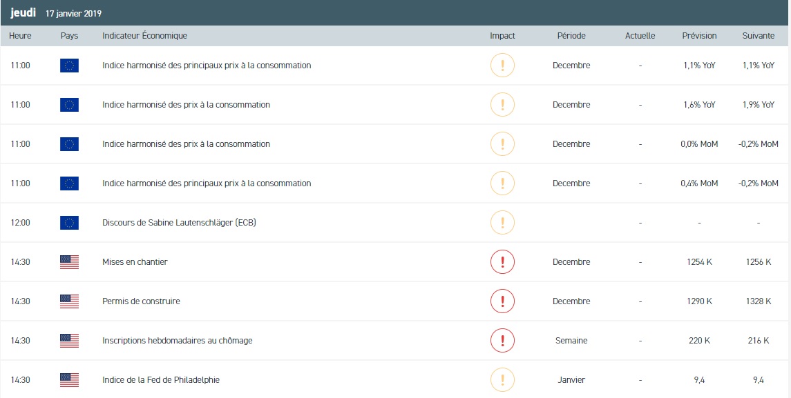La motion de censure déposée contre Theresa May n’a pas produit les effets escomptés. Pour aujourd’hui le marché se focalisera sur la poursuite du ralentissement en Chine dont la croissance est estimée à 6,3 pour 2019. En outre, Bloomberg nous informe ce matin que des procureurs américains ont ouvert une enquête sur le groupe Huawei Technologies pour cause de vol de secrets industriels et commerciaux. Concernant le calendrier économique de ce jeudi, les opérateurs s’intéresseront à l’indice des prix à la consommation du mois de décembre en zone euro et au rapport mensuel de l’OPEP. Du côté des Etats-Unis, nous prendrons connaissance du nombre de permis de construire délivrés et aux mises en chantier du mois de décembre. Par ailleurs, on s’intéressera aux inscriptions hebdomadaires au chômage de la semaine dernière et à l’indice d’activité manufacturière dans la région de Philadelphie. Enfin, la saison des résultats se poursuivra ce jeudi avec les publications de Netflix, Morgan Stanley, American Express et de BB&T.