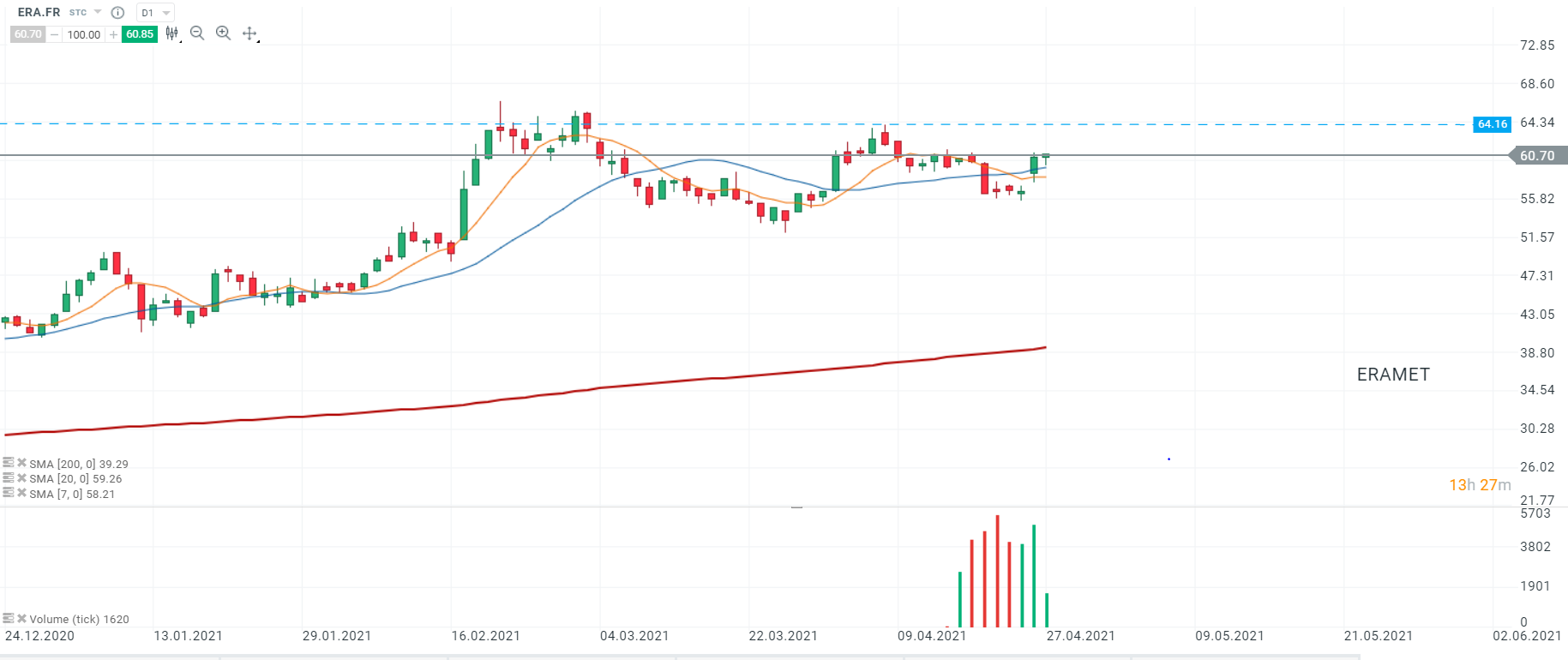 Le titre Eramet (ERA.FR) a gagné plus de 30% depuis le début de l'année, porté par la forte croissance des métaux. Après une ouverture hier en forte hausse, les cours poursuivent leur ascension en direction de la zone de résistance au niveau des 64,16.En cas de franchissement de ce niveau, le mouvement haussier pourrait s’étendre jusqu’au sommet du 22/02 à 66,78. Source : xStation5