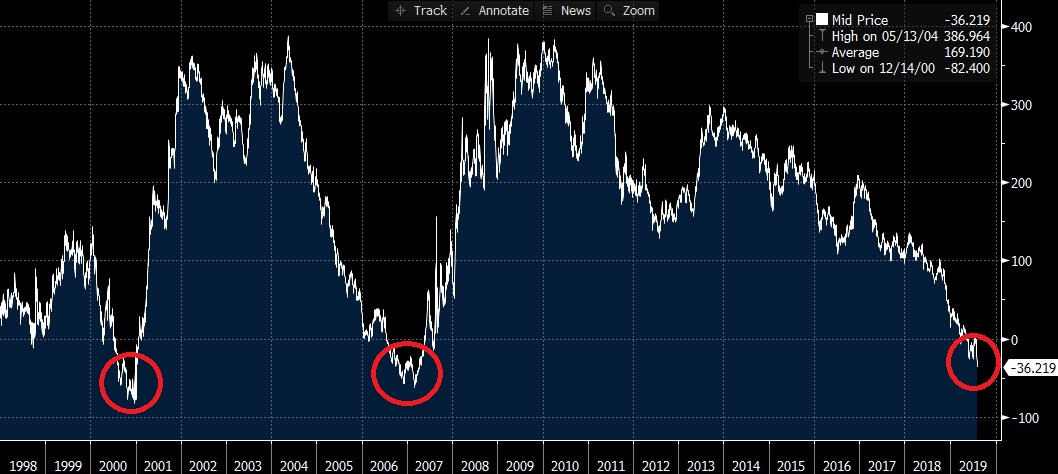 Le spread (l’écart) entre le rendement du taux d’emprunt à 3 mois et à 10 ans a atteint un plus bas depuis plus de 12 ans. Certains interprètent cela comme le signe avant-coureur d’une récession. Source : Bloomberg.