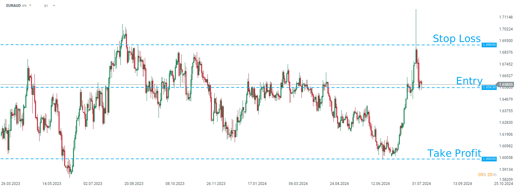 Nomura conseille d’ouvrir une position courte sur EURAUD au prix du marché, avec un objectif fixé à 1,6000 et un ordre de stop loss placé à 1,6900. Source : xStation5