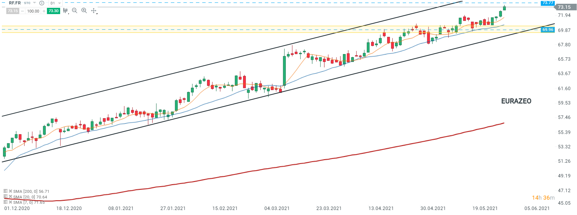 Le titre Eurazeo (RF.FR) entame sa quatrième séance consécutive de hausse, continuant d’évoluer au sein de son canal ascendant intégré en novembre 2020. Au moment de la rédaction de ces lignes, les cours se dirigent vers la zone de résistance à 73,77. Si le sentiment actuel prévaut, et que le niveau mentionné ci-dessus est cassé, le mouvement haussier pourrait s’étendre vers la borne supérieure du canal à 75,39. Toutefois, si les vendeurs prennent le contrôle, la zone coïncidant avec la zone de support, la SMA 20 (ligne bleue) et la borne inférieure du canal à 69,96 constitue la prochaine cible. Source : xStation5