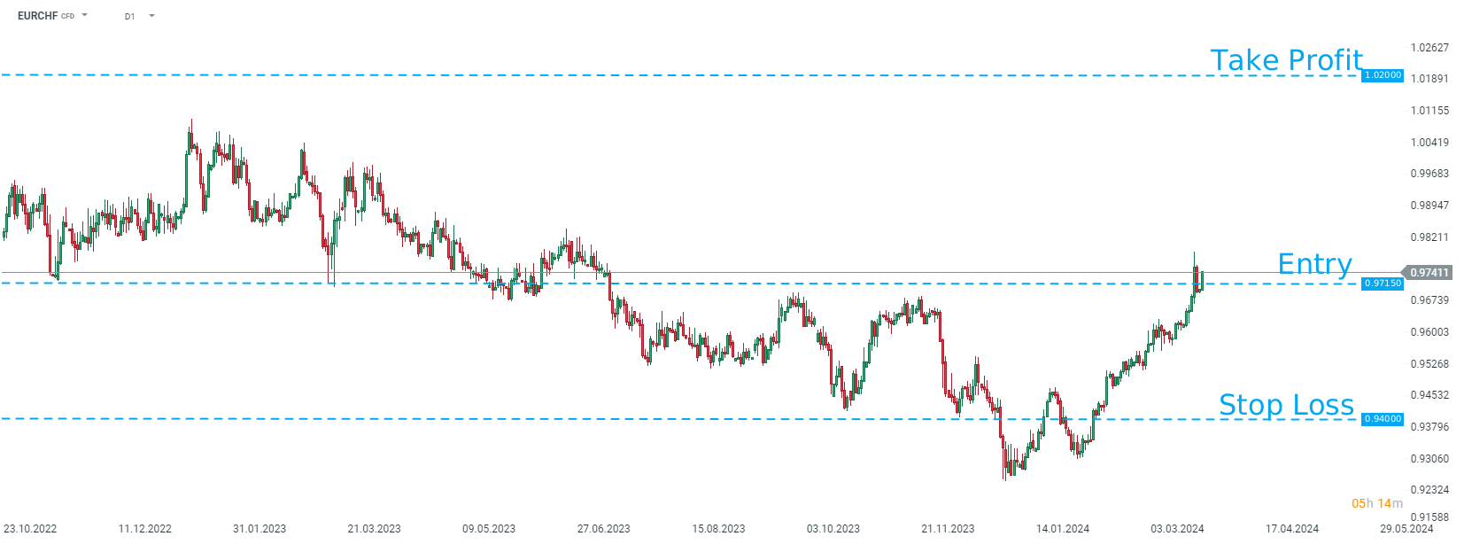 ANZ recommande de prendre une position longue sur l'EURCHF au prix du marché avec un objectif de 1,0200 et un ordre stop loss placé à 0,9400. Source: xStation5