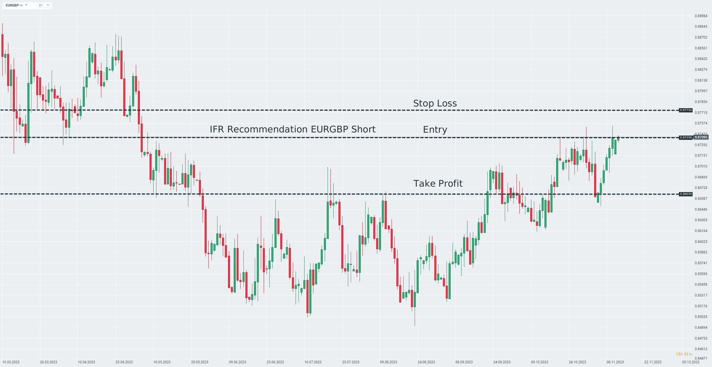 L'IFR recommande de prendre une position courte (ou vente) sur la paire EURGBP au prix du marché avec un objectif à 0,8665 et un ordre stop loss à 0,8775. Source: xStation5