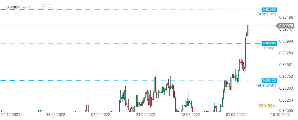 Le Crédit Agricole recommande de prendre une position à la vente sur l'EURGBP à 0,8888 avec un objectif de 0,8652 et un ordre stop loss placé à 0,9100. Source : xStation5