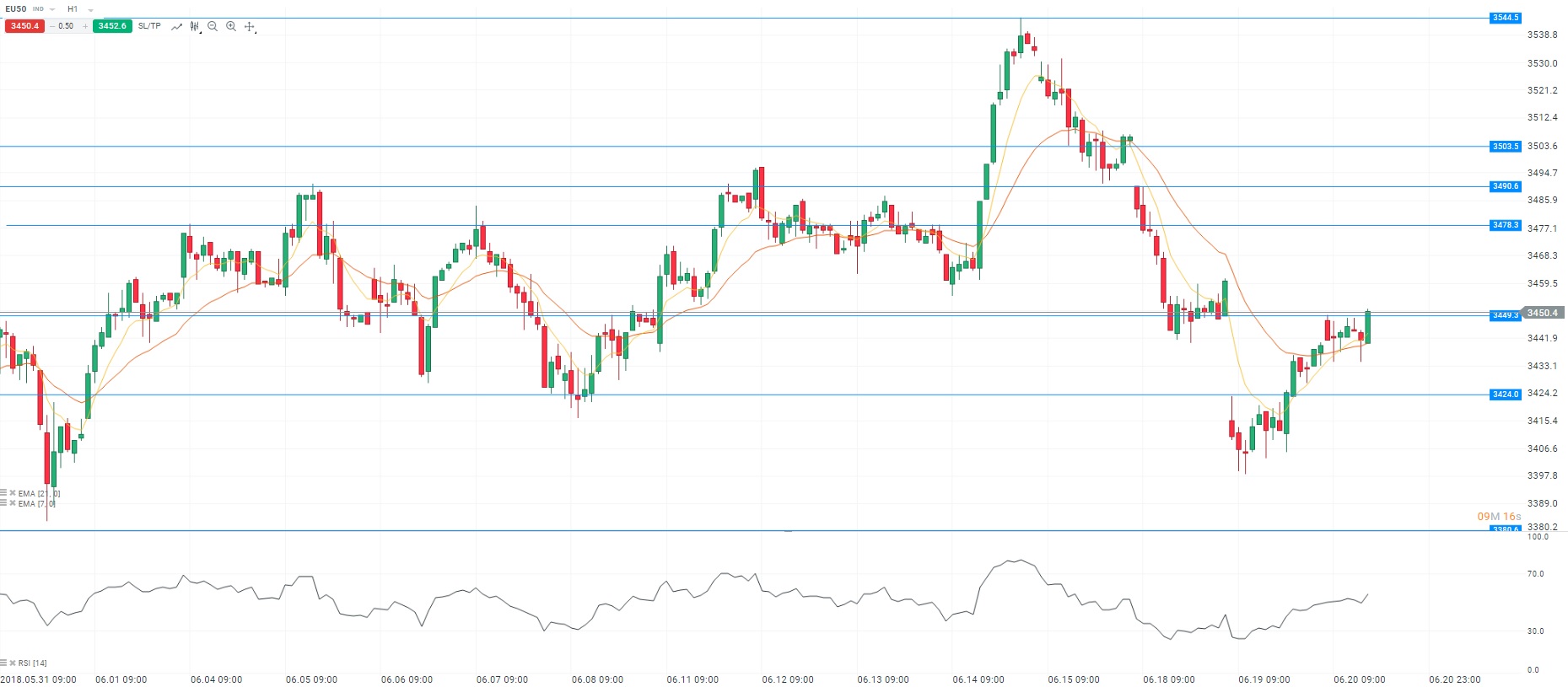 Les négociations avancent entre Emmanuel Macron et Angela Merkel concernant la zone euro. En effet, les deux dirigeants se sont mis d’accord sur un budget commun en zone euro à l’horizon 2021. Cet accord vise à accroitre « la compétitivité et la convergence » économique à travers l’investissement. Reste à savoir quel montant sera alloué au budget commun alors que les 17 autres membres doivent encore se prononcer. Par ailleurs, une refonte du mécanisme européen de stabilité (MES) a également été évoquée. Dans le même temps, les ministres de l’Economie allemand et français ont fait part de leur volonté de créer un fonds dont l’objectif serait de favoriser les réformes structurelles. Concernant l’analyse technique, les cours fluctuent au-dessus de la moyenne mobile courte (à 7 périodes) en unité de temps horaire (H1). Le RSI est orienté à la hausse autour de sa zone de neutralité. Ces éléments nous conduisent à avoir une préférence à l’achat avec pour objectif le niveau des 3 478 points.