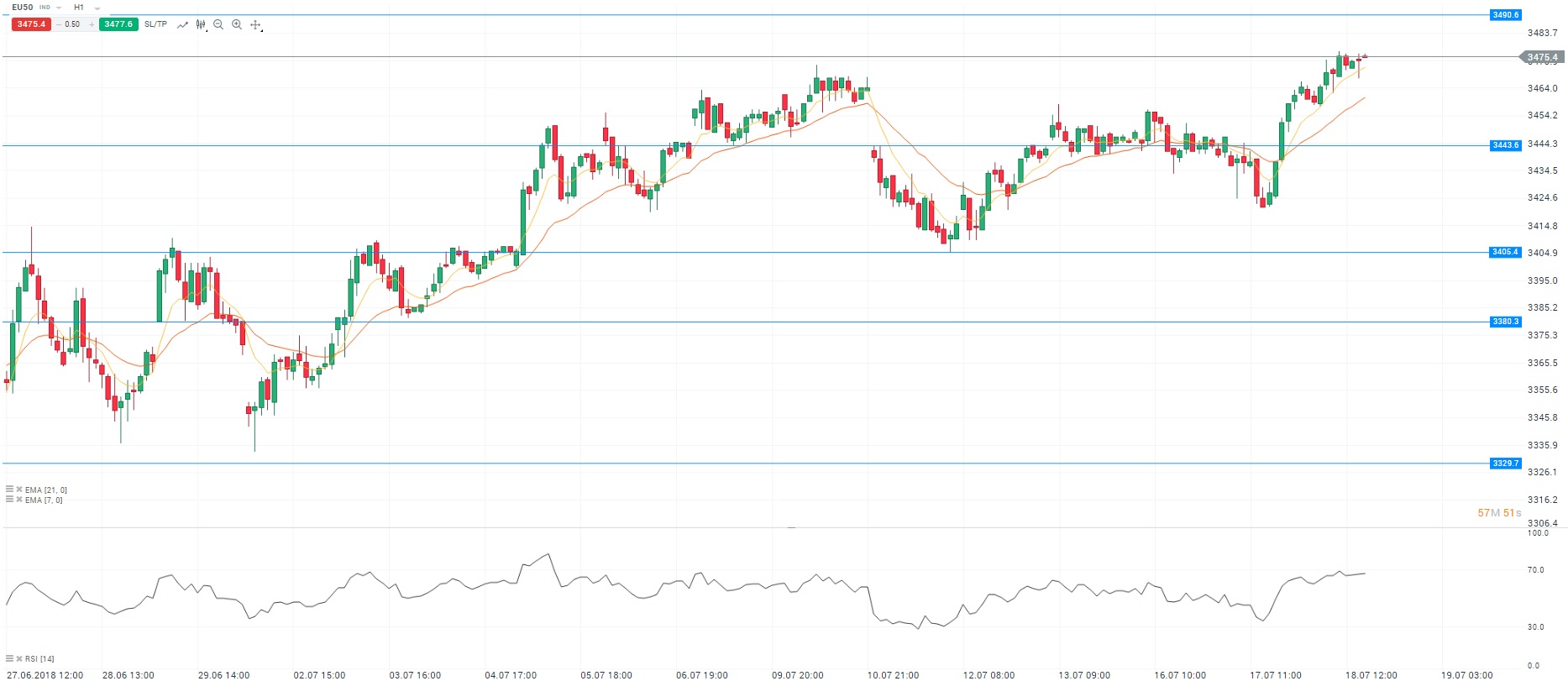 Eurostat a publié les chiffres définitifs de l’indice des prix à la consommation du mois de juin en zone euro. L’inflation est ressortie en ligne avec les données prévisionnelles à 2%. Pour rappel, les prix ont progressé de 1,9% en mai. L’indicateur a donc atteint la cible fixée par la Banque centrale européenne (BCE). Sur le plan commercial, l’Union européenne (UE) a annoncé la mise en place de mesures de précaution sur l’acier afin d’empêcher une arrivée massive du métal, destiné à l’origine aux Etats-Unis. L’UE devrait agir au travers de quotas et de droits de douane. Enfin, la Commission européenne a sanctionné Google d’une amende de 4,34 milliards de d’euros pour un motif de « pratiques illégales ». D’un point de vue technique, les cours évoluent au-dessus de la moyenne mobile courte (à 7 périodes) en unité de temps horaire (H1). Le RSI est stable proche de sa zone de surachat. En conclusion, nous avons un biais acheteur avec comme objectif le niveau des 3 490 points.