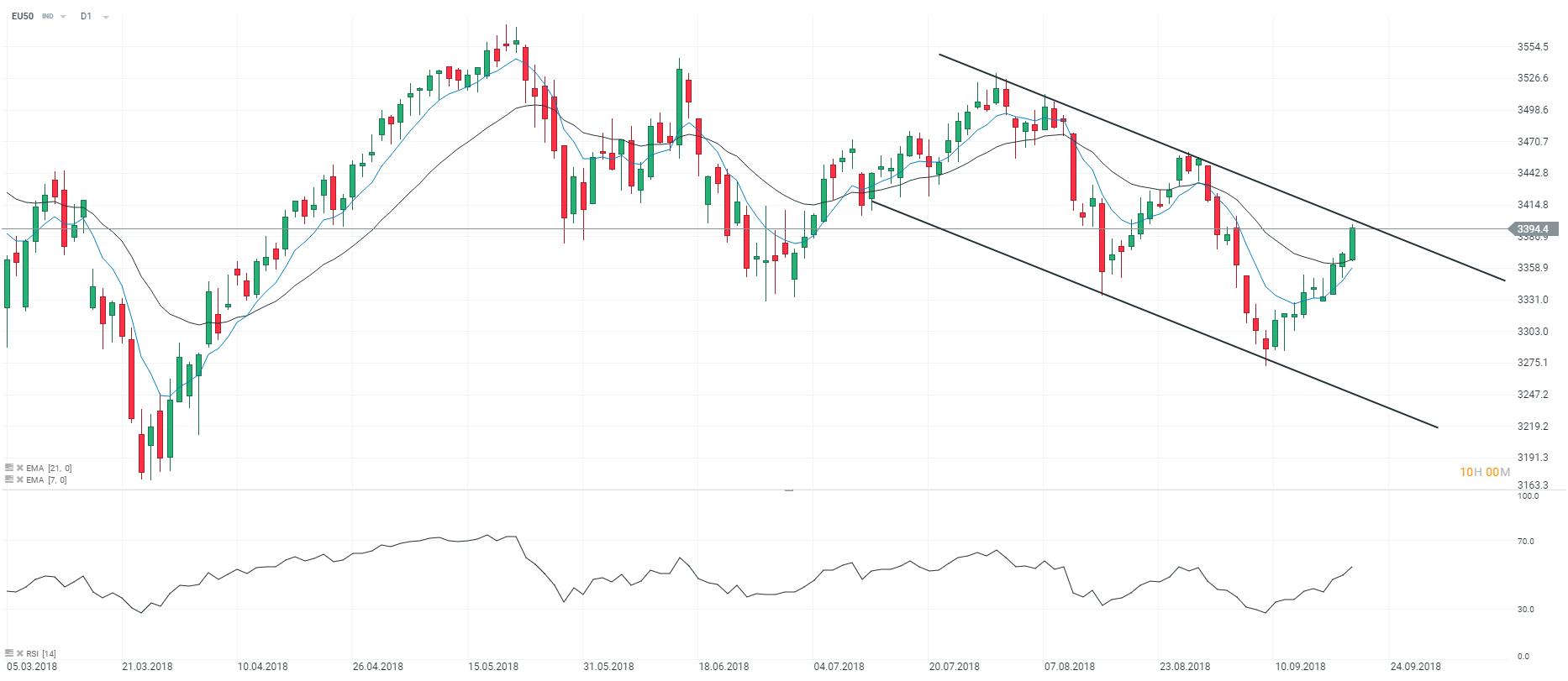 D’un point de vue technique, l’indice Euro Stoxx 50 évolue en tendance haussière en unité de temps journalière (D1). Et pour cause, nous remarquons que l’indice retrouve des couleurs depuis le 10 septembre, soit depuis quasiment deux semaines. Nous observons sur le graphique ci-dessus que les prix sont soutenus par les moyennes mobiles à 7 et 21 périodes. Concernant le RSI, l’oscillateur est bien orienté et oscille au-dessus des 54. Malgré la présence du canal baissier, nous avons un biais acheteur sur l’indice car nous pensons que le canal à une forte probabilité d’être cassé par le haut.