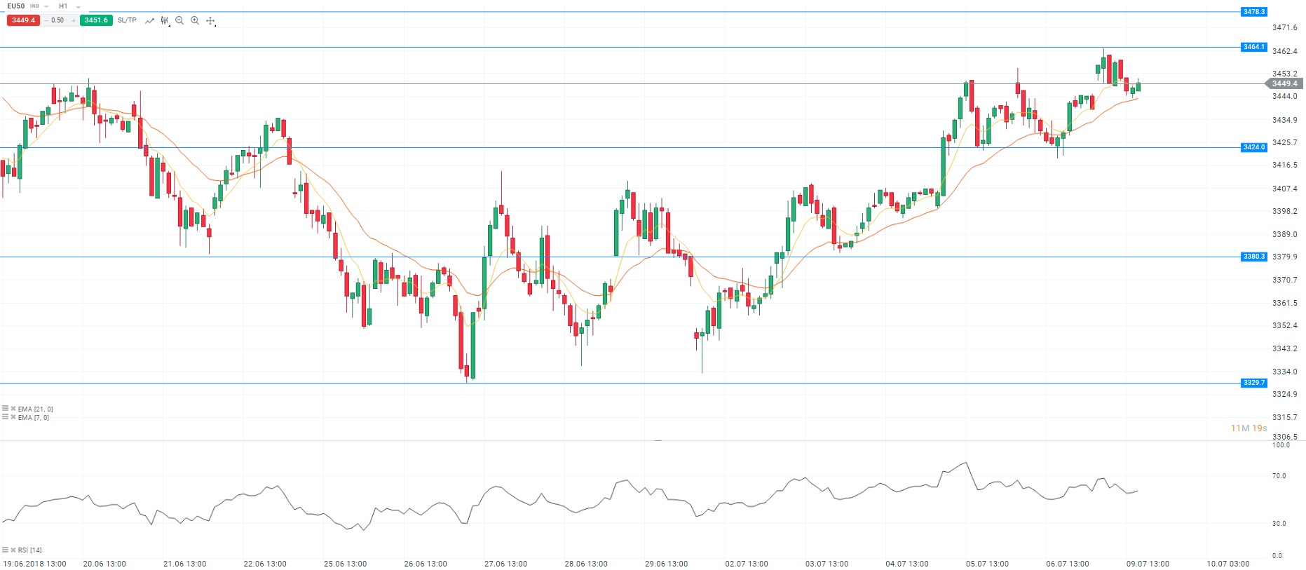 Les statistiques sur le marché de l’emploi aux Etats-Unis continuent de soutenir les indices internationaux. En Europe, nous avons pris connaissance des données relatives au commerce extérieur en Allemagne pour le mois de mai. Ainsi, on note une progression de 1,8% des exportations allemandes, contre une hausse de 0,8% en prévision. Dans le même temps, on constate une amélioration du moral des investisseurs en zone euro au travers de l’indice Sentix de confiance. Ces publications soutiennent l’euro sur le marché des changes. La paire EURUSD progresse sur le niveau de 1,1771 dollar pour un euro. Cependant, la menace de droits de douane américains sur les véhicules européens reste présente. Enfin, nous serons attentifs aux déclarations de Mario Draghi, président de la Banque centrale européenne, devant la Commission des affaires économiques et monétaires du Parlement européen. Sur un plan technique, les cours oscillent autour de la moyenne mobile courte (à 7 périodes) en unité de temps horaire (H1). Le RSI est orienté à la hausse autour de sa zone de neutralité. Pour conclure, nous sommes acheteurs avec comme objectif le niveau des 3 464 points.