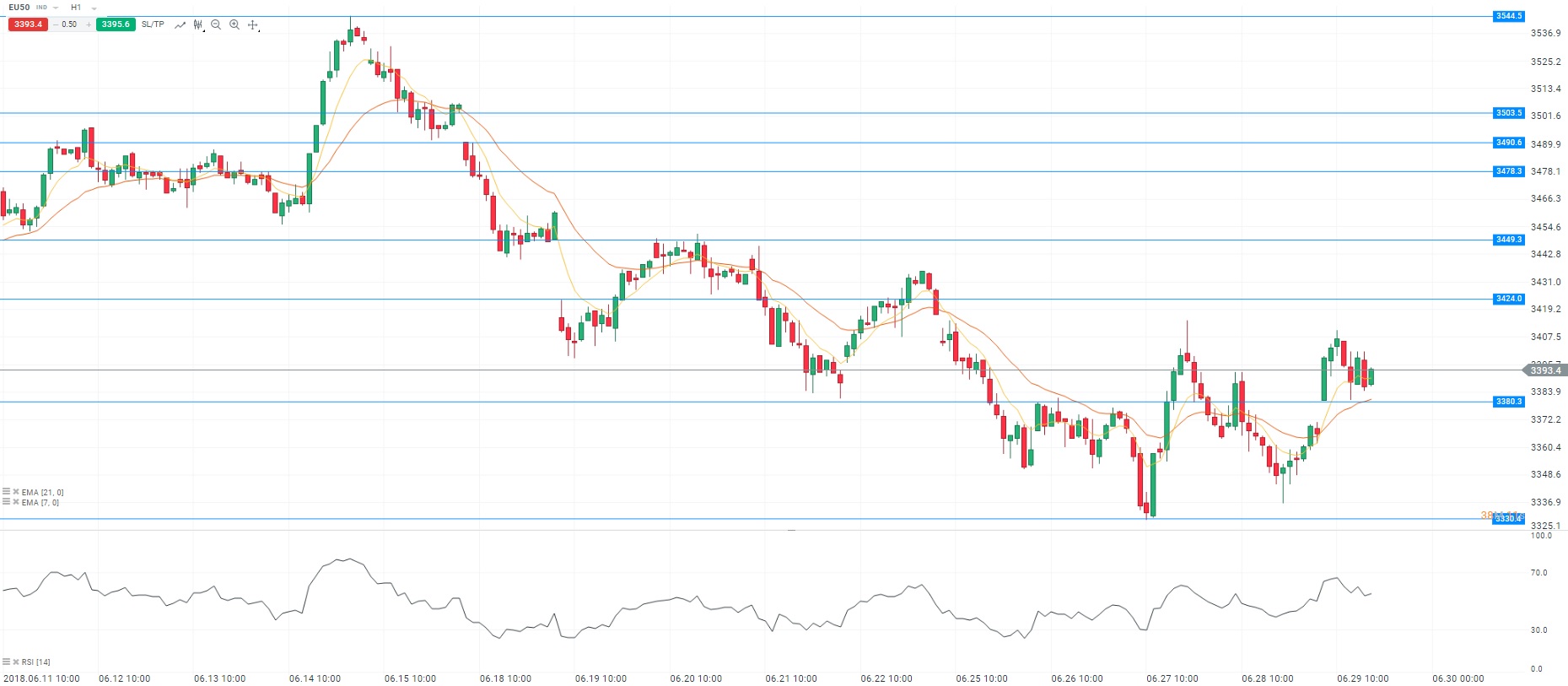 Eurostat a publié l’indice des prix à la consommation du mois de juin en zone euro. La hausse des prix de l’énergie et des produits alimentaires ont entrainé une progression de 2% de l’inflation sur cette période. L’objectif de la Banque centrale européenne (BCE) est donc atteint. Cette publication confirme le biais adopté par l’institution de Francfort. Pour rappel, la BCE a annoncé la normalisation progressive de sa politique monétaire. Sur le marché des changes, l’euro retrouve des couleurs après l’annonce d’un consensus au sein des membres de l’Union européenne sur le dossier migratoire. Enfin, on note un rebond des secteurs de la technologie et de l’automobile particulièrement exposés aux tensions commerciales. Sur un plan technique, les cours oscillent au-dessus de la moyenne mobile courte (à 7 périodes) en unité de temps horaire (H1). Le RSI est orienté à la hausse vers sa zone de surachat. Pour conclure, nous sommes acheteurs avec comme objectif le niveau des 3 424 points.