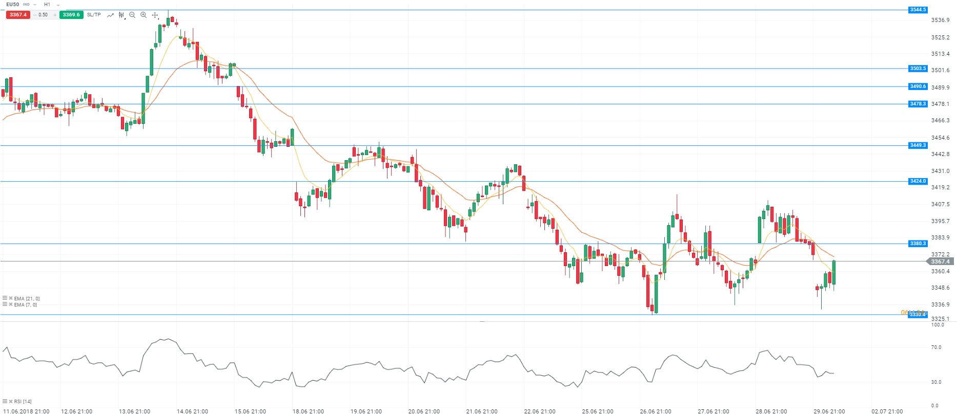 Les indices PMI manufacturier sont à l’honneur ce matin. En ce qui concerne la zone euro, l’indicateur est ressorti en dessous des attentes du consensus à 54,9, contre 55 en prévision soit un plus bas d’un an et demi. Cette statistique nous révèle un ralentissement de la croissance du secteur manufacturier au mois de juin en zone euro. Par ailleurs, Eurostat a fait état d’un léger recul du taux de chômage sur le niveau des 8,4% pour la zone euro. Le chef économiste de Markit a expliqué que ce ralentissement était dû à l’instabilité politique surtout en Italie. Pour rappel, la Banque centrale européenne anticipe une croissance de 2,1% pour l'année 2018 en zone euro. Sur un plan technique, les cours oscillent au-dessus de la moyenne mobile courte (à 7 périodes) en unité de temps horaire (H1). Le RSI est stable autour de sa zone de neutralité. Pour conclure, nous sommes acheteurs avec comme objectif le niveau des 3 380 points.