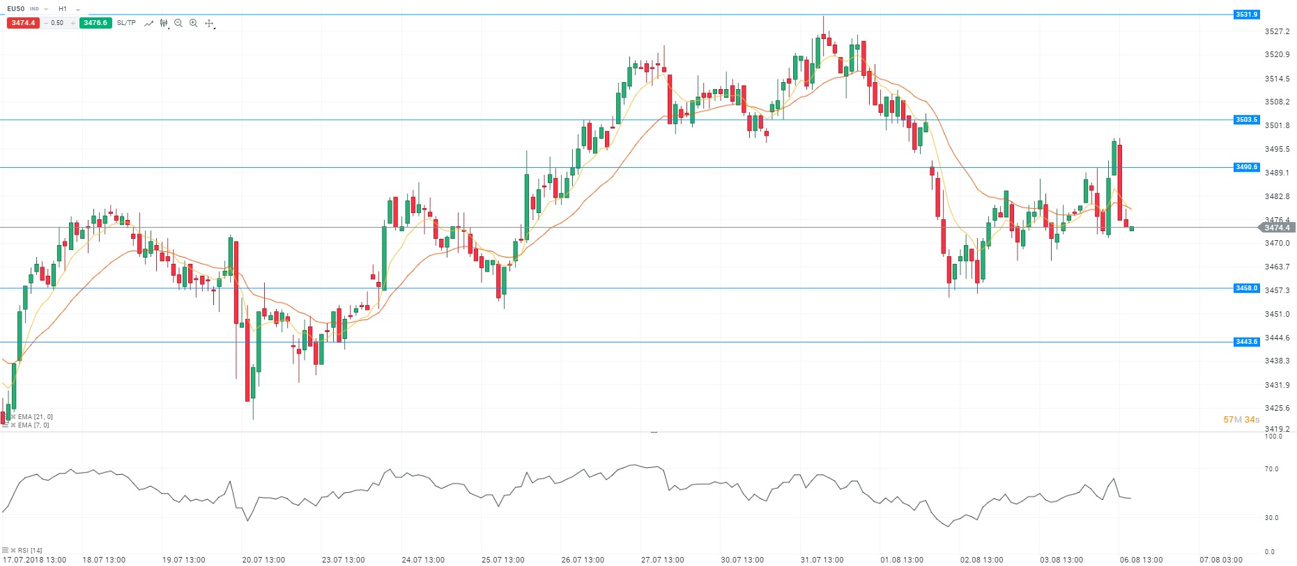 Nous avons pris connaissance du chiffre des commandes à l’industrie du mois de juin en Allemagne. On constate une chute de 4% des commandes à l’industrie synonyme de ralentissement de l’activité sur cette période. En effet, ces dernières ont diminué de 4% en juin, soit la plus forte baisse depuis le mois de janvier 2017. Par ailleurs, l’indice Sentix de confiance des investisseurs est sorti supérieur aux attentes, en août, à 14,7 contre 12,8 en prévision. Du côté des valeurs, le secteur des matières premières est pénalisé par les tensions commerciales. Enfin, sur le marché des changes, la paire EURUSD poursuit sa baisse au niveau de 1,1542$ pour un euro. L’euro étant pénalisé par le ralentissement de l’activité industrielle en Allemagne. Sur un plan technique, les cours oscillent sous les moyennes mobiles (à 7 et 21 périodes) en unité de temps horaire (H1). Le RSI est orienté à la baisse autour de sa zone de neutralité. Pour conclure, nous sommes vendeurs avec comme objectif le niveau des 3 458 points.