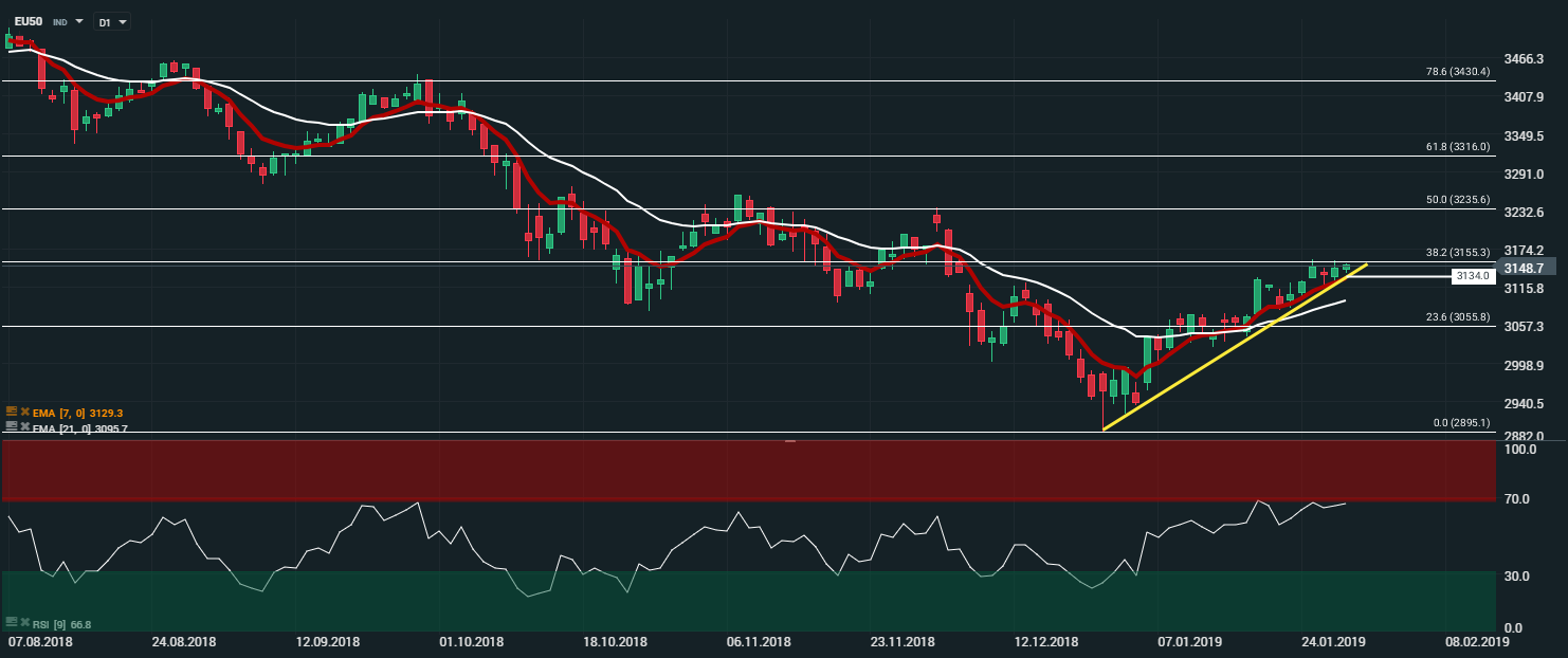 Depuis le 27 décembre 2018, l’indice gagne plus de 8.50 %, malgré les mauvaises nouvelles qui continuent de s’accumuler dans le monde et en Europe, les opérateurs persistent et signent : l’indice doit monter. Plus qu’une nécessité, ce postulat c’est transformé en un véritable crédo. Pour s’en convaincre, il suffit de voir l’absence totale de réaction des marchés suite aux mauvaises publications des PMI manufacturier et des services pour le mois de décembre, des indicateurs en zone euro du sentiment des services, de l’industrie et du consommateur, mais également les révisions à la baisse des perspectives de croissance des différents pays de la zone euro. A titre d’exemple, le ministre allemand de l’Economie a annoncé ce matin réviser la croissance allemande pour l’année 2019 à 1% au lieu de 1.8%. Mais aujourd’hui les investisseurs éclipsent totalement ces publications, préférant s’en remettre à la Fed et à la décision de l’institution de mettre un coup d’arrêt à sa politique de resserrement monétaire.