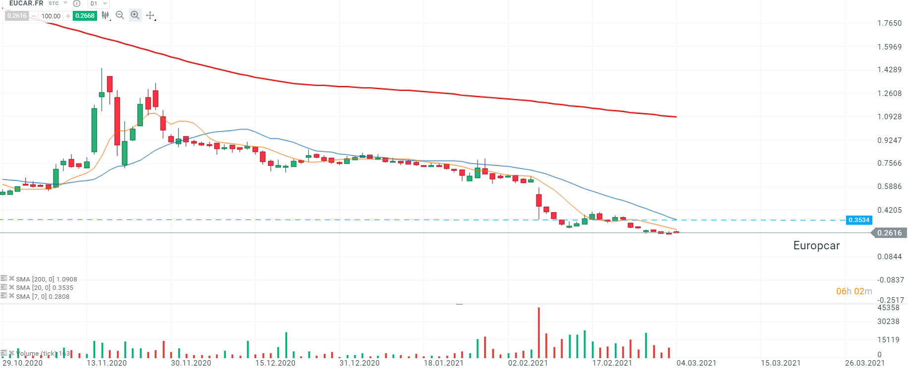 Les cours d’Europcar (EUCAR.FR) ont ouvert avec un léger gap haussier mais peinent à se redresser après avoir marqué un nouveau creux la veille. La résistance actuelle est représentée par la SMA 7 (ligne orange). En cas de franchissement de ce niveau, le prochain niveau à aller chercher est la SMA 20 (ligne bleue) à 0,3534, ce qui permettrait un comblement du gap du 05/02. Source : xStation5