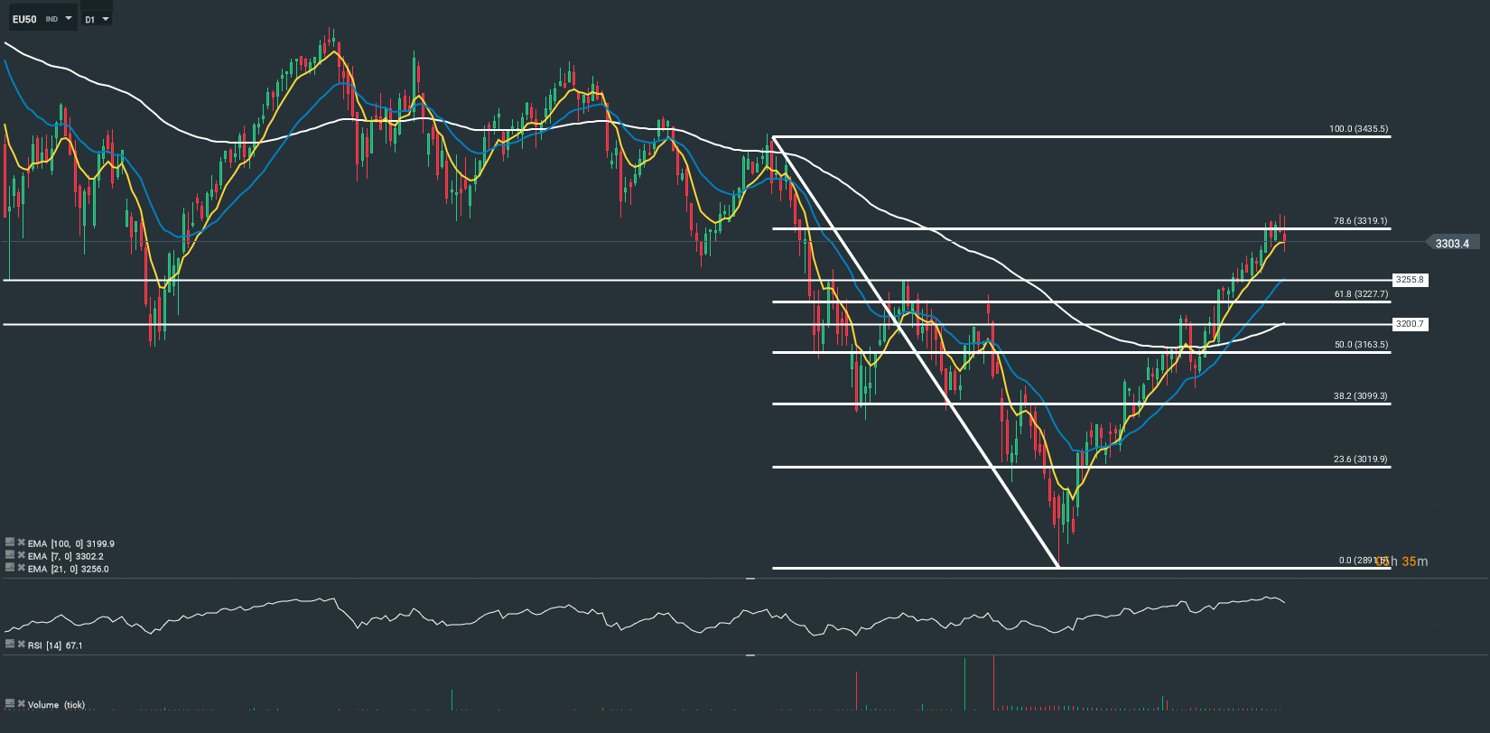 Sur le plan technique, en horizon temporel journalier (D1), l’indice européen évolue à la baisse. Les cours sont capés par le seuil des 78,6 % des retracements de Fibonacci (3 319 points). La moyenne mobile à 7 périodes a été franchie à la baisse. Le RSI est orienté à la baisse. Nous avons un biais baissier sur l’Eurostoxx50.