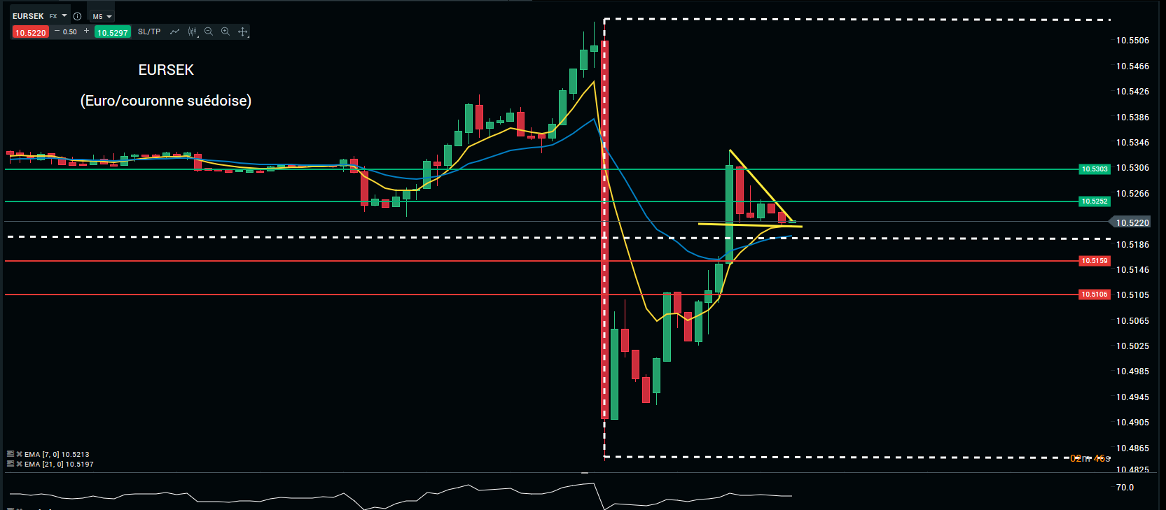 Après l’annonce de la Riksbank, la couronne suédoise s’est appréciée 0,3 % face à l’euro, l’EURSEK atteignant les 10,4865 couronnes pour 1 euro. Nous avons assisté par la suite à un retracement à hauteur de 50 % de la chute instantanée. A l’instant où nous rédigeons cette note, la paire évolue dans un triangle ascendant. Les prochains discours des gouverneurs de la zone euro orienteront la paire.