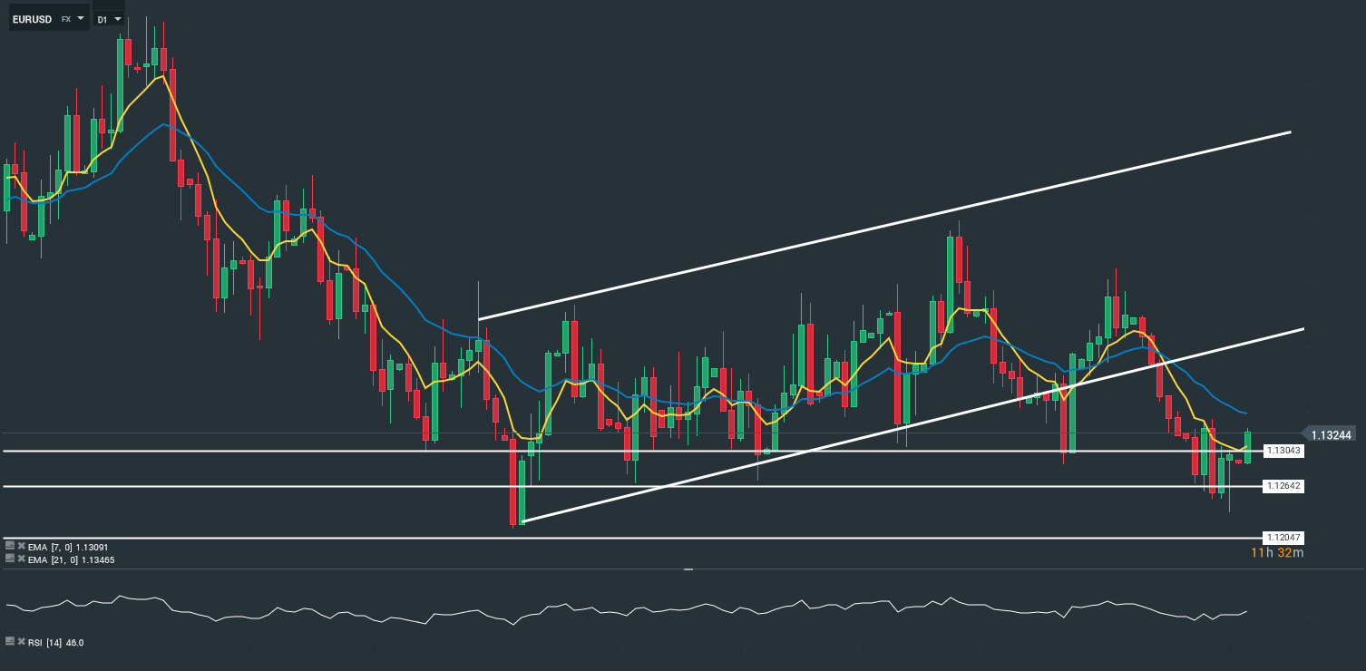Sur le plan technique, en horizon temporel journalier (D1), nous voyons que le discours de Benoit Cœuré a eu un impact sur la paire. En effet, nous remarquons que celle-ci n’a pas résisté aux pressions baissières. Ces dernières ce sont matérialisées par la rupture des 1,1264 $ pour 1 €, le 15 février 2019. Pour l’heure, la paire EURUSD est orientée à la hausse. Les prix sont portés par la moyenne mobile à 7 périodes, mais capés par la 21 périodes. Enfin, le RSI oscille autour de sa zone de neutralité (46,0). Pour conclure, nous avons un biais relativement positif sur la paire EURUSD.