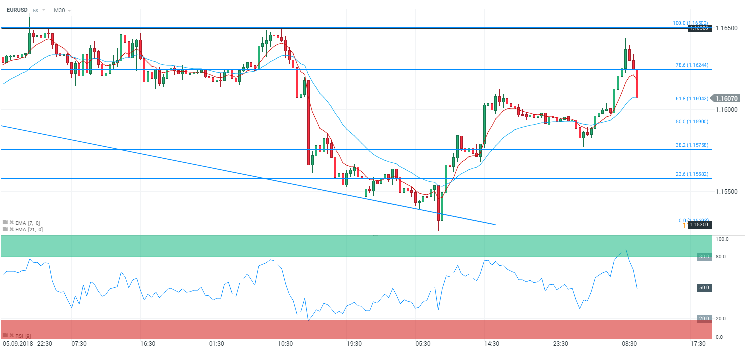 La devise EURUSD évolue depuis le début de ce mois de septembre dans une zone de range comprise entre 1,1530 $ et 1,1650 $ pour 1€. En unité de temps 30 minutes (M30), les prix ont cassé à la baisse le niveau des 78,6% des retracements de Fibonnaci. De plus, le RSI est orienté à la baisse et se dirige à présent vers sa zone de neutralité. Pour le moment l’oscillateur évolue à 47,9 points. Les prix restent soutenus par la moyenne mobile à 21 périodes depuis le début à la séance du jour. Au moment où nous écrivons ses lignes, les prix sont venus toucher le niveau des 61,8% des retracements de Fibonnaci à 1,1604 $ pour 1€. Dans ce contexte, nous serons haussier au-dessus des 1,1604 $ (61,8% des retracements de Fibonnaci) en direction des 1,1650 $ - avec un premier objectif à 1,1624 $ (78,6% des retracements de Fibonnaci). En cas de cassure des 1,1604 $, nous serons baissier sur l’EURUSD avec en ligne de mire les 1,1590 $ (50% des retracements de Fibonnaci).