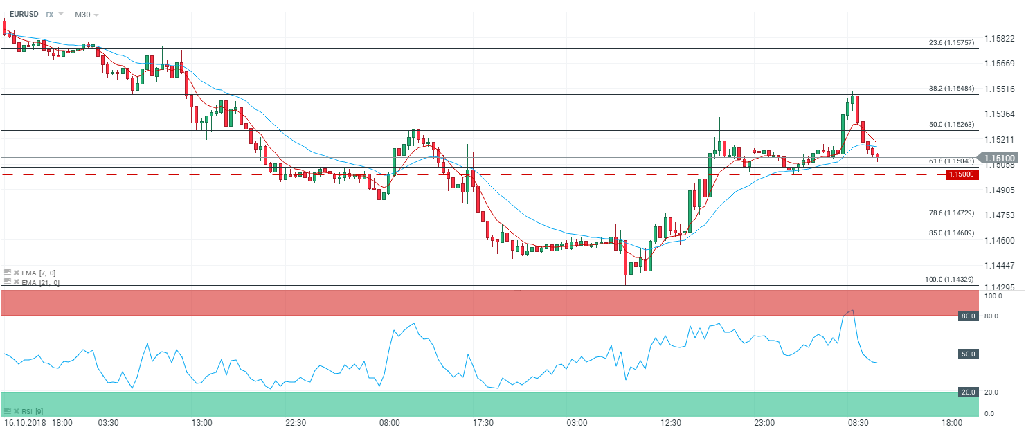 En 30 minutes (M30), la paire EURUSD évolue toujours au sein de sa zone de range comprise entre 1,15500 $ et 1,14330 $. Les prix fluctuent au-dessus des 1,15 $ - correspondant aux 61,8 % des retracements de Fibonnaci. Les cours sont capés par les moyennes mobiles à 7 et 21 périodes. Le RSI est orienté à la baisse et oscille proche de sa zone de neutralité à 42,4 points. Dans ce contexte nous avons un baissier sur la paire EURUSD en cas de cassure du support es 1,15 $, avec en ligne de mire le niveau des 1,1480 $ - et par extension le niveau des 1,1460 $.