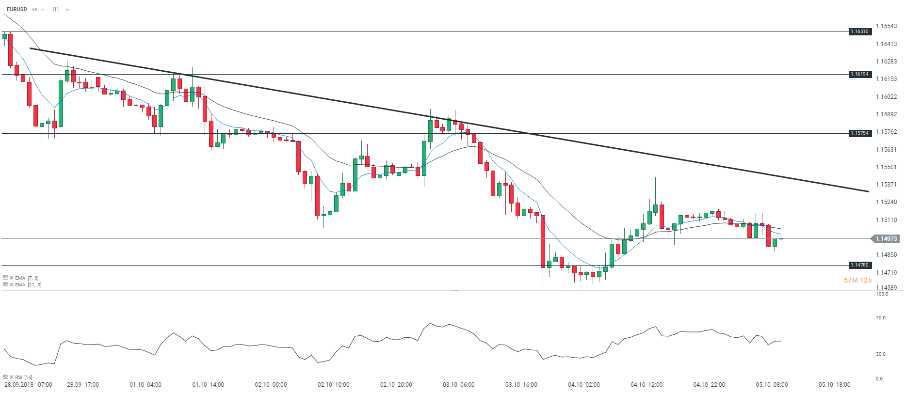 D’un point de vue technique, la paire EURUSD évolue en tendance baissière en unité de temps horaire (H1). En effet, nous observons sur le graphique ci-dessus que les prix sont capés par les moyennes mobiles à 7 et 21 périodes. Concernant le RSI, l’oscillateur fluctue sous sa zone de neutralité autour des 44. Dans la mesure où les cotations sont résilientes autour des 1,15 $ pour 1 €, nous avons un léger biais acheteur et anticipons un retour sur la zone des 1,1540 $ pour 1 € à court terme.