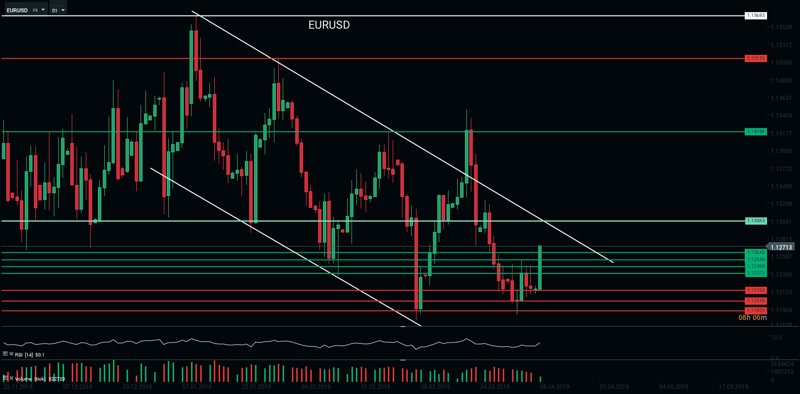 L’EURUSD s’envole après que le monde financier ait eu écho d’une réunion ce mardi entre T.May, Angela Merkel et Emmanuel Macron. Theresa May rencontrera la chancelière allemande et le président français dans le but de sortir de l'impasse et d’obtenir une "Flextension" (un Brexit sur le long terme). Il semble que les discussions entre T.May et le travailliste J.Corbyn, entamées ce lundi, avancent à grand pas. Cette conjonction d’éléments aboutit à une appréciation de l’euro vis-à-vis du dollar.