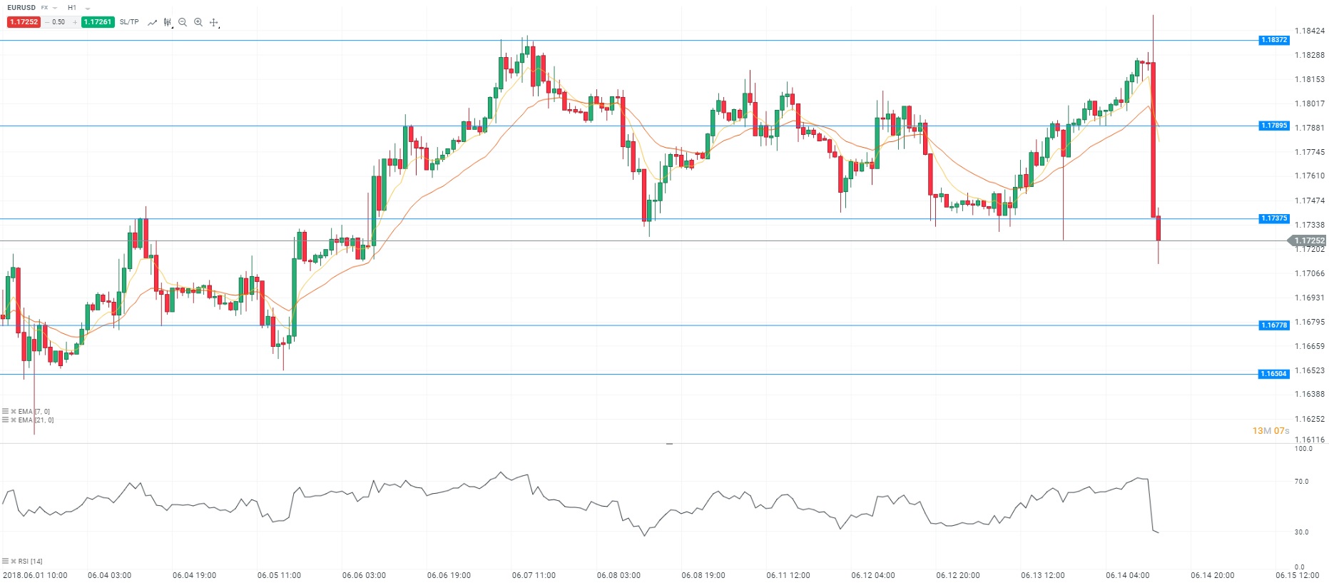 Au moment où nous écrivons ces lignes, l’actif recule sur le niveau de 1,1725$ après l’annonce de l’arrêt du programme d’assouplissement quantitatif de la Banque centrale européenne (BCE) à la fin de l’année. En effet, l’institution diminuera progressivement le montant destiné aux rachats d’obligations de 30 milliards à 15 milliards d’euros sur les trois derniers mois de l’année. Concernant les taux, le Conseil des gouverneurs a déclaré au travers du communiqué que les taux resteront inchangés « aussi longtemps que nécessaire ». Pour rappel, le taux de refinancement s’établit à 0% alors que le taux de facilité de prêt marginal se stabilise à 0,25% et le taux de facilité de dépôt à -0,4%. Nous serons attentifs aux prévisions de l’institution sur la croissance et l’inflation. D’un point de vue technique, les prix évoluent sous les moyennes mobiles (à 7 et 21 périodes) en unité de temps horaire (H1). Le RSI est orienté à la baisse vers sa zone de survente. En conclusion, nous avons un biais vendeur avec comme objectif le niveau de 1,1677 dollar pour un euro.
