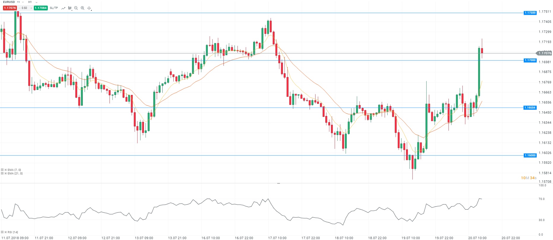 Représentation technique de la paire EURUSD, en H1