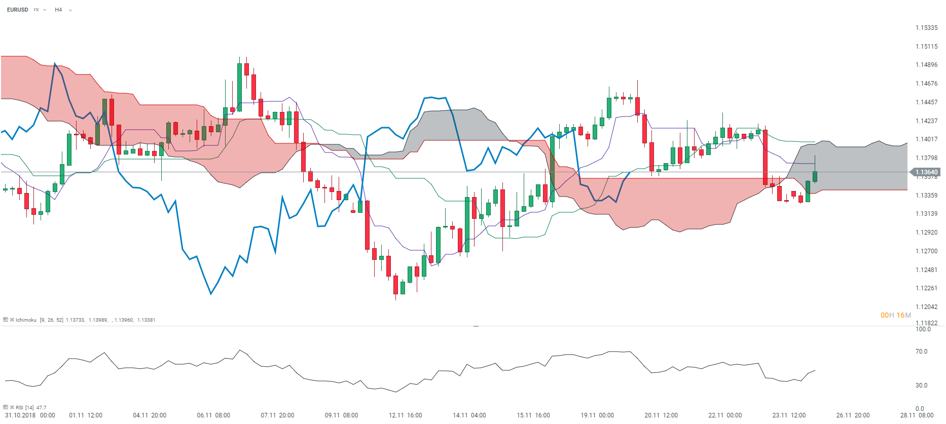 Sur le volet des changes, la paire EURUSD progresse de 0,25 % à 1,1364 $ pour 1 €. D’un point de vue technique, la paire est en phase de consolidation en unité de temps quatre heures (H4). Et pour cause, d’après le critère Ichimoku, les prix n’indiquent pas de réelle tendance car ils fluctuent à l’intérieur du nuage Kumo. Néanmoins, nous notons la présence d’intentions vendeuses autour des 1,1375 $, soit le niveau de la Tenkan (courbe mauve). Concernant le RSI, l’oscillateur évolue sous sa zone de neutralité à 47,8. Malgré la toile de fond, nous pensons que les prix pourraient renouer avec le niveau des 1,1390 $ pour 1 € à court terme.