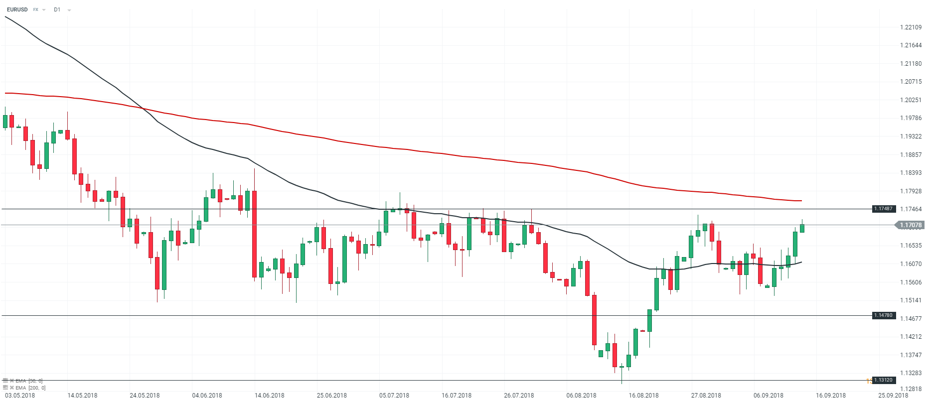Représentation technique de la paire EURUSD, en D1