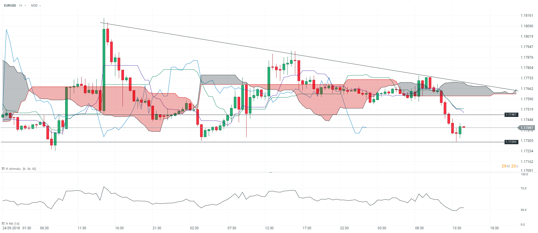 D’un point de vue technique, la paire EURUSD évolue en tendance baissière en unité de temps 30 minutes (M30). En effet, nous observons sur le graphique ci-dessus que les prix sont capés par le nuage Kumo, la Tenkan (courbe mauve) et la Kijun (courbe verte). En outre, la Lagging-Span (courbe bleue) est orientée à la baisse et fluctue sous les prix. Concernant le RSI, l’oscillateur est stable autour de sa zone de survente et devrait prochainement regagner du terrain. Dans ce contexte, nous anticipons un rebond technique sur la paire EURUSD et pensons que l’actif devrait renouer avec le niveau de 1,1760 $ pour 1 € à court terme.