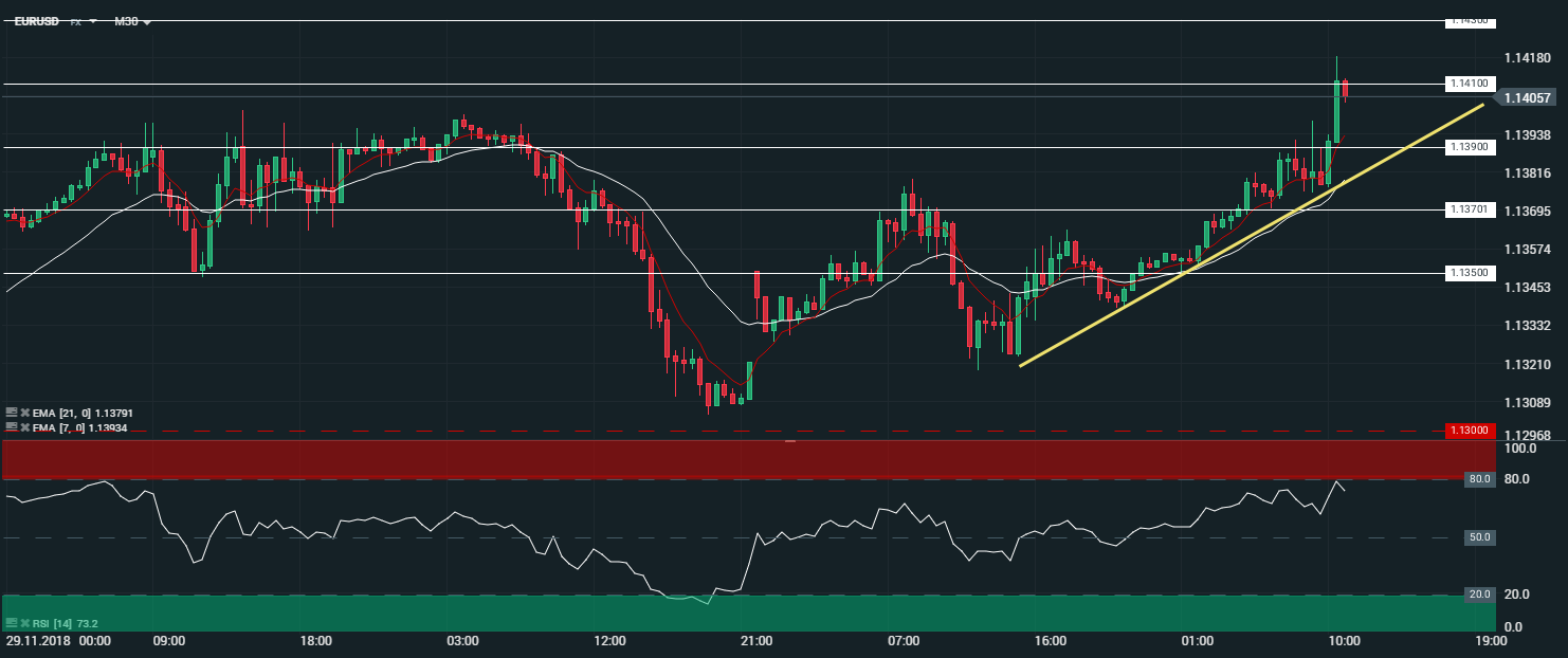 En unité de temps 30 minutes (M30), la paire EURUSD évolue en tendance haussière. Les cours sont portés par les moyennes mobiles à 7 et 21 périodes. Le RSI est orienté à la baisse proche de sa zone de « sur achat » et oscille à 72 points. Dans ce contexte, nous serons haussiers sur l’actif, en comme objectif le niveau des 1,1430 $.