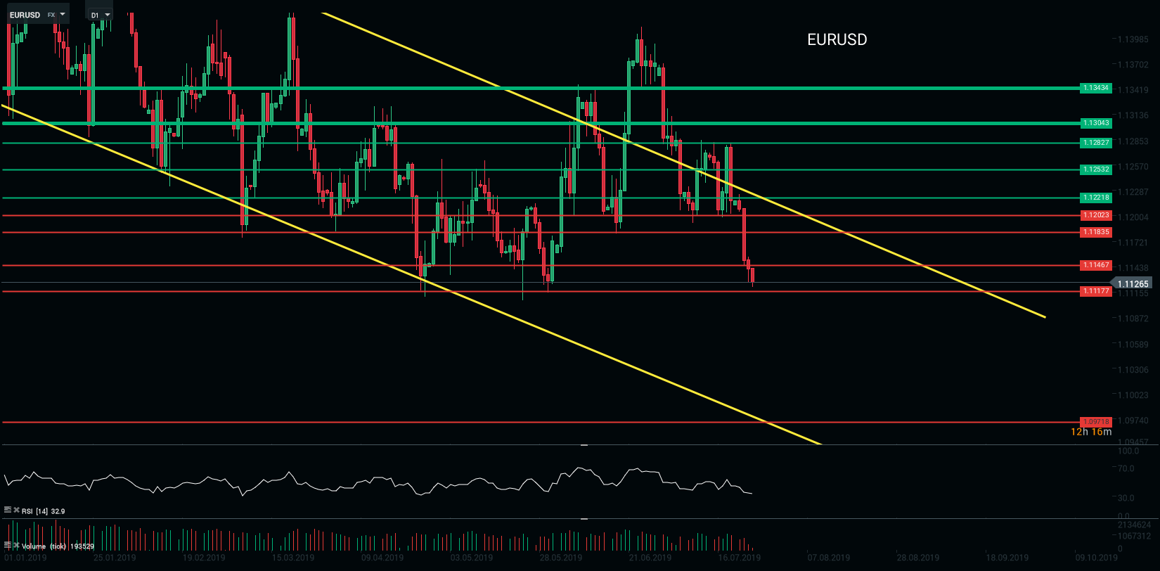 Représentation technique de la paire EURUSD, en D1
