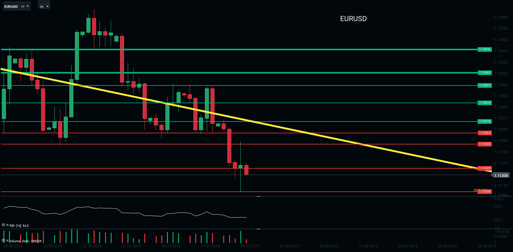 La paire chute après les bonnes nouvelles en provenance des Etats-Unis. La croissance du Produit intérieur brut (PIB) pour le deuxième trimestre aux Etats-Unis est ressortie au-dessus des attentes, à 2,1 % contre 1,8 % anticipé par le consensus. Pour les investisseurs et la Réserve fédérale l’équation se complique. En effet, si ce ne sont les exigences de D.Trump ou bien les caprices du marché, nous ne pouvons dire qu’une baisse des taux est justifiée la semaine prochaine.