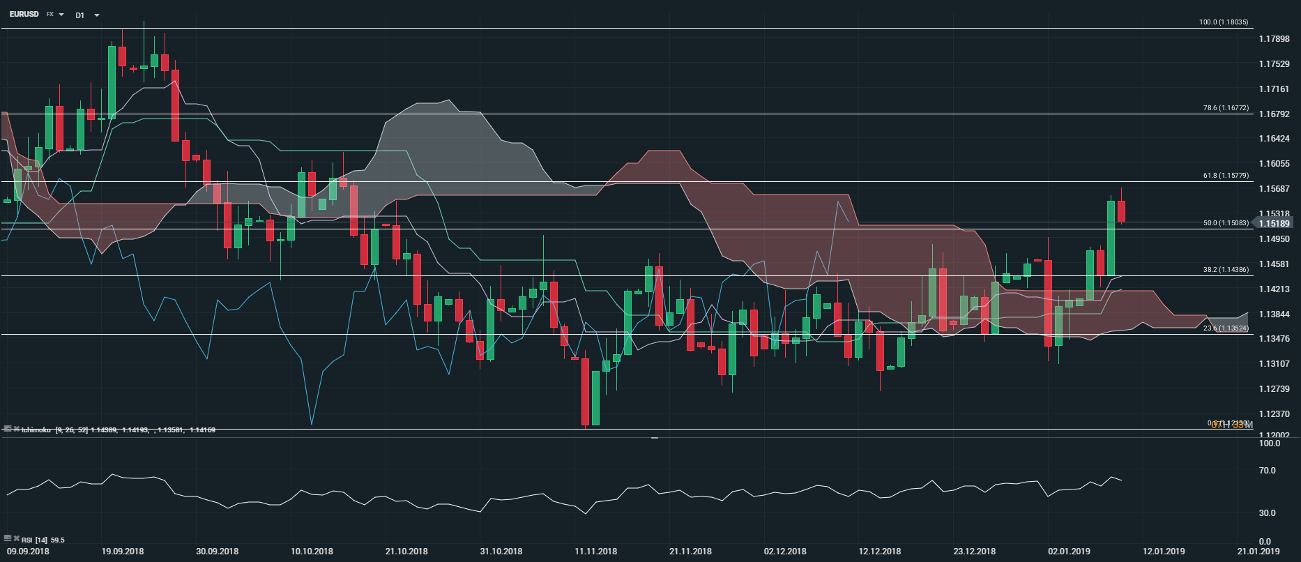 En unité de temps journalière (D1), la paire EURUSD évolue en tendance haussière. En effet, au regard du critère Ichimoku la toile de fond est foncièrement positive. Et pour cause, les prix sont soutenus par le nuage Kumo, la Tenkan (courbe mauve) et la Kijun (courbe verte). Par ailleurs, la Lagging-Span (courbe bleue) est orientée à la hausse et fluctue au-dessus des cotations. Concernant le RSI, l’oscillateur est orienté à la hausse et fluctue au-dessus de sa zone de neutralité, autour de 59,6. Malgré la correction de ce jeudi, nous remarquons que les prix restent portés par le niveau des 50 % des retracements de Fibonacci (1,15 $). Dans un tel contexte, nous conservons un avis positif sur la paire EURUSD et pensons qu’elle pourrait renouer avec le niveau des 61,8 % des retracements de Fibonacci (1,1577 $) à court terme.