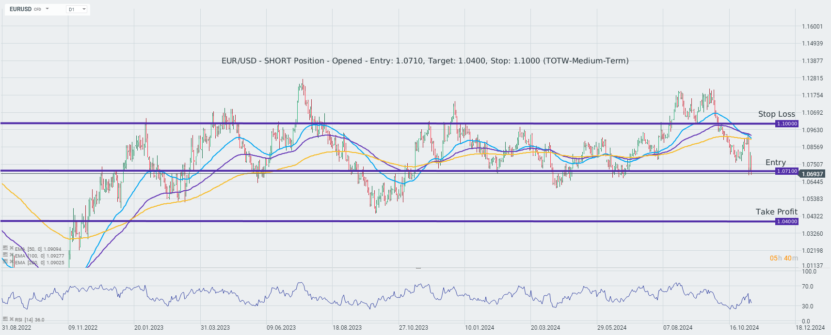 MUFG recommande de prendre une position courte sur l'EURUSD au prix du marché avec un objectif de 1,0400 et un ordre stop loss placé à 1,1000. Source: xStation5