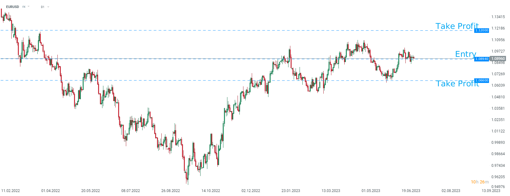 Nomura recommande de prendre une position longue sur l'EUR/USD au prix du marché avec un objectif de 1.1200 et un ordre stop-loss placé à 1.0660. Source : xStation5