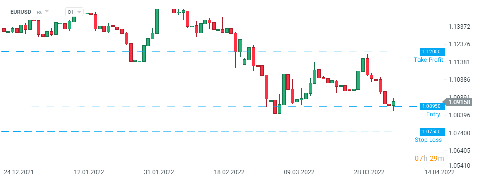SEB recommande de prendre une position à l'achat sur l'EURUSD à 1,0895 avec un objectif de 1,1200 et un ordre stop loss placé à 1,0750. Source : xStation5