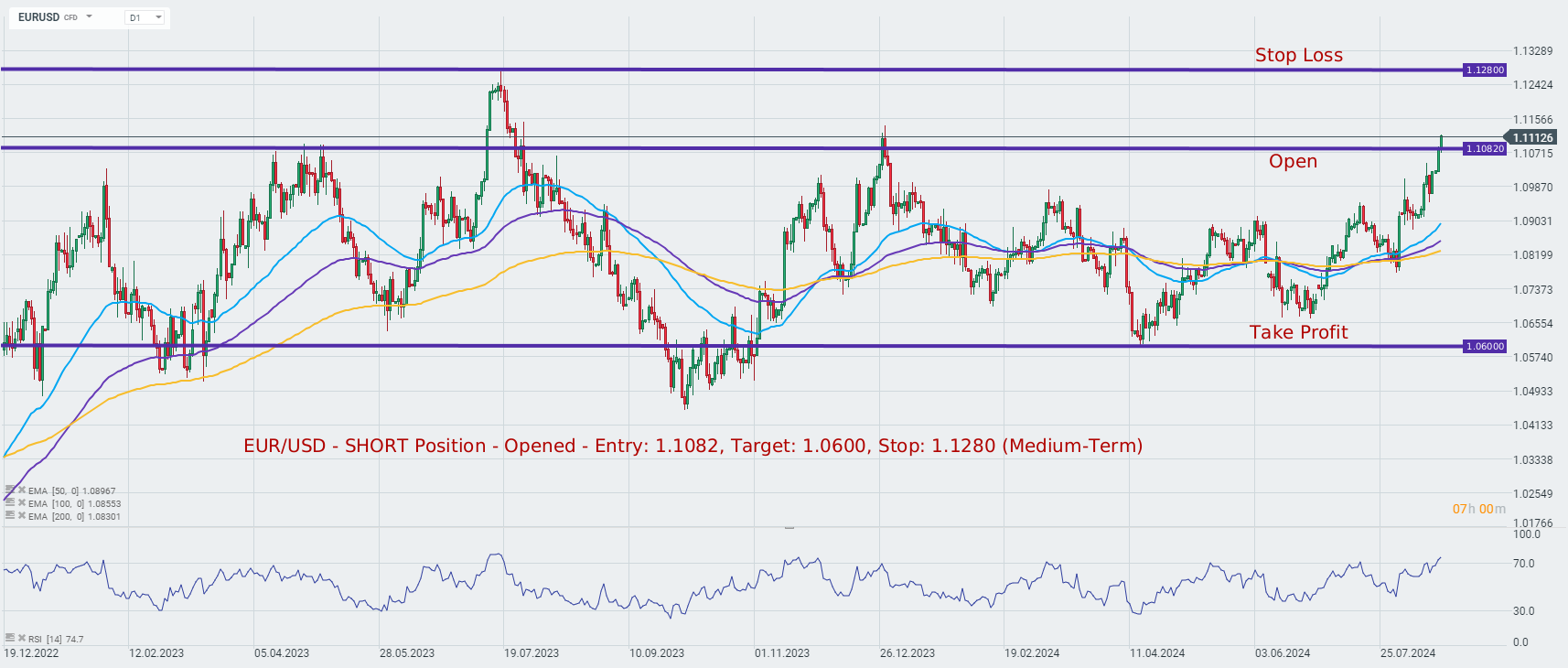 Le Crédit Agricole recommande de prendre une position courte sur l'EURUSD au prix du marché avec un objectif de 1,0600 et un ordre stop loss placé à 1,1280. Source : xStation5