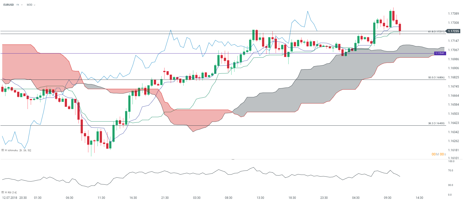 Sur le plan technique, la paire EURUSD évolue en tendance haussière en unité de temps M30. En effet, nous notons sur le graphique ci-dessus que les prix sont portés par le nuage Kumo et la Kijun (courbe verte). Dans le même temps, la Lagging-Span (courbe bleue) est orientée à la hausse et progresse au-dessus des cours. Néanmoins, nous faisons état de velléités baissières sur l’actif car les prix sont capés par la Tenkan (courbe mauve). Pour conclure, nous avons biais vendeur sur la paire et pensons que l’actif pourrait renouer avec le niveau des 1,1705 $ pour 1 € à court terme.