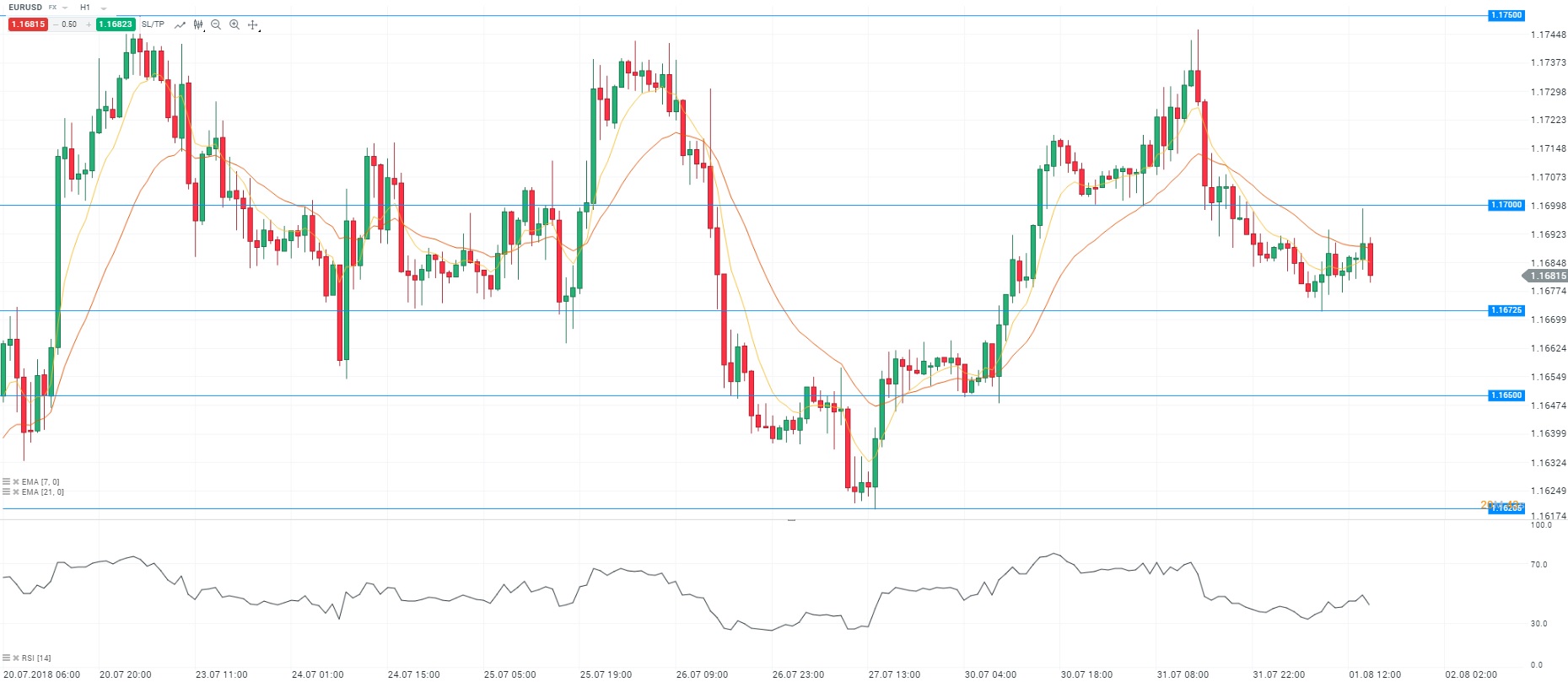 Représentation technique de la paire EURUSD, en H1