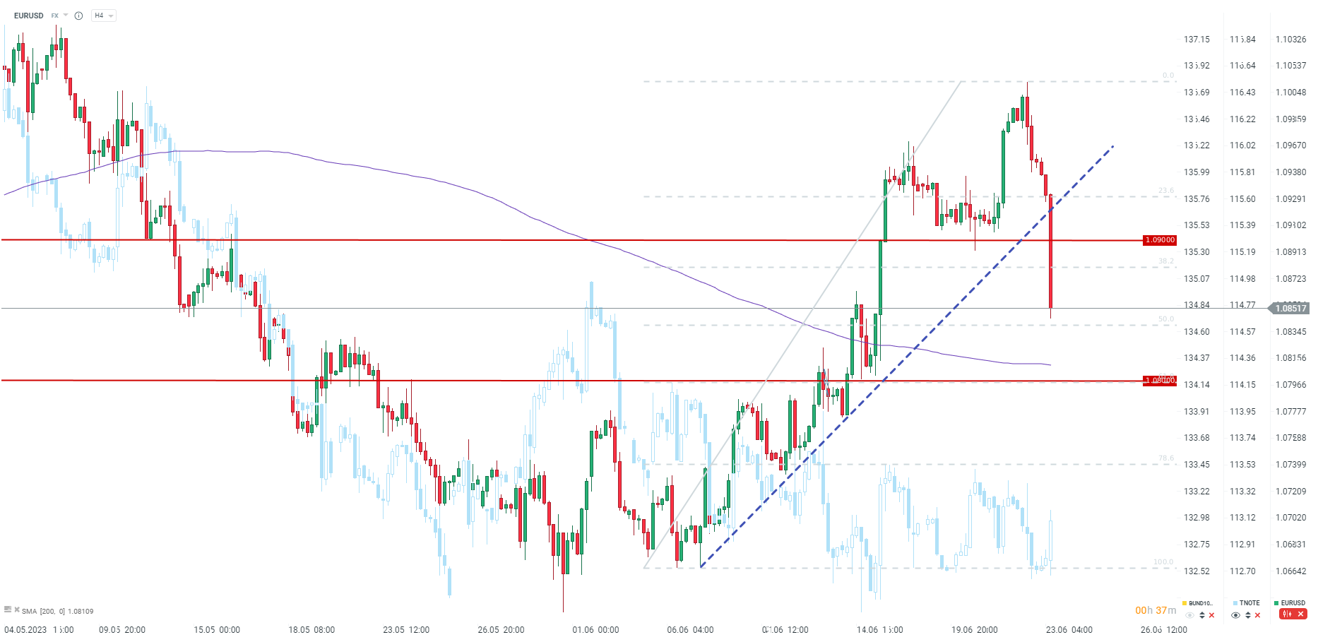 Si des données concrètes telles que la production industrielle ou les ventes au détail commencent à refléter les préoccupations des entrepreneurs, la Banque centrale européenne devra peut-être reconsidérer sa position hawkish, qui suggère actuellement deux hausses de taux supplémentaires cette année. De plus, le dollar américain bénéficie des commentaires hawkish du président de la Fed, Powell, plus tôt cette semaine, qui a clairement laissé entendre que deux autres hausses de taux aux États-Unis sont le scénario de base pour le moment.